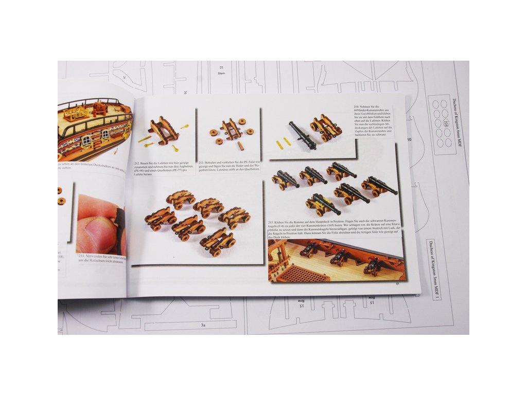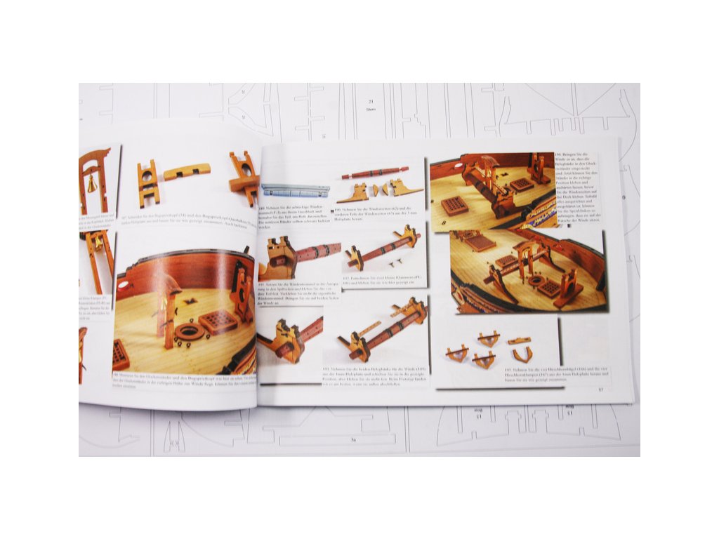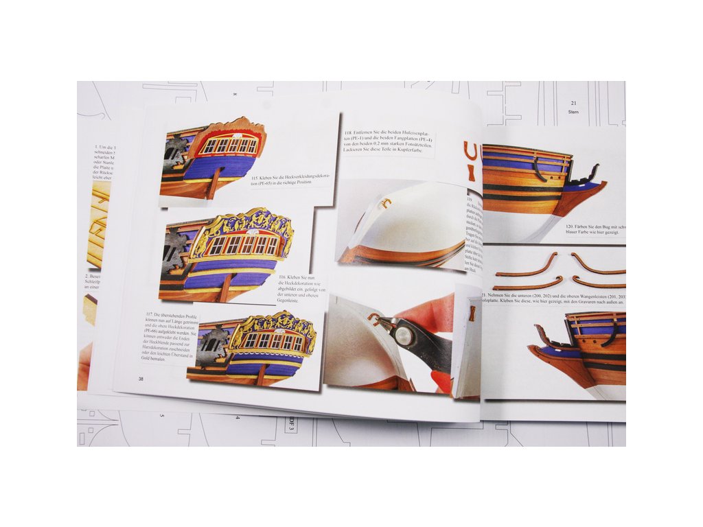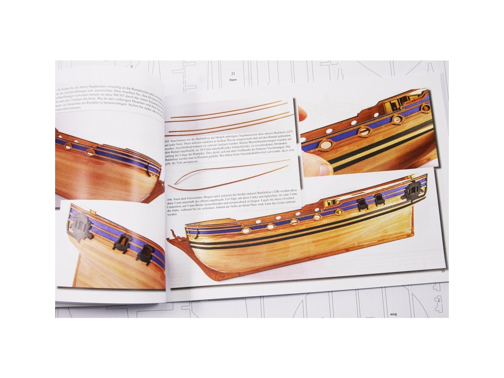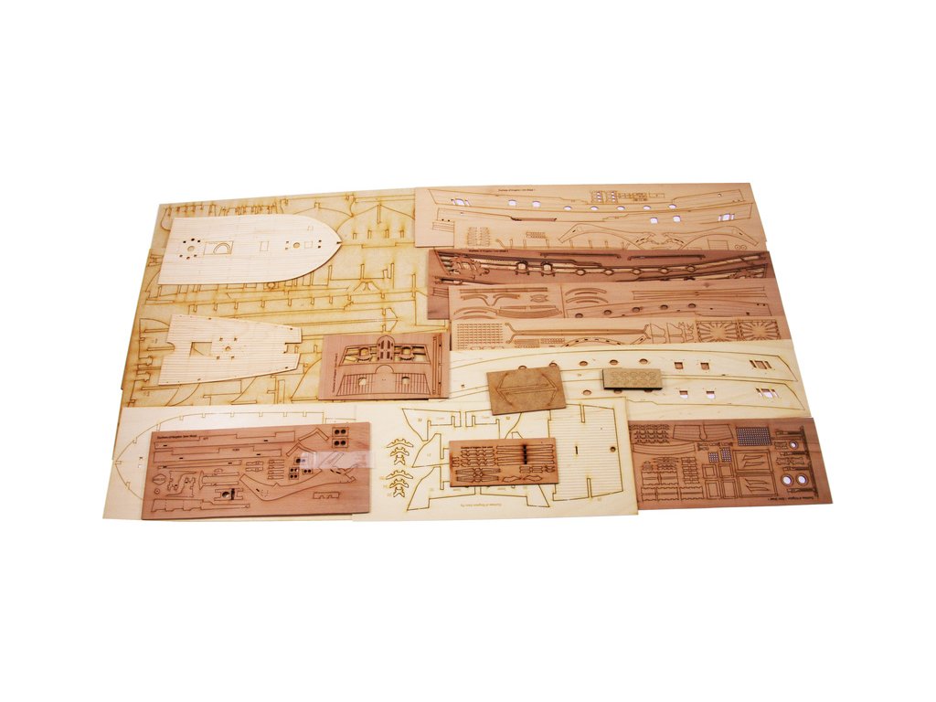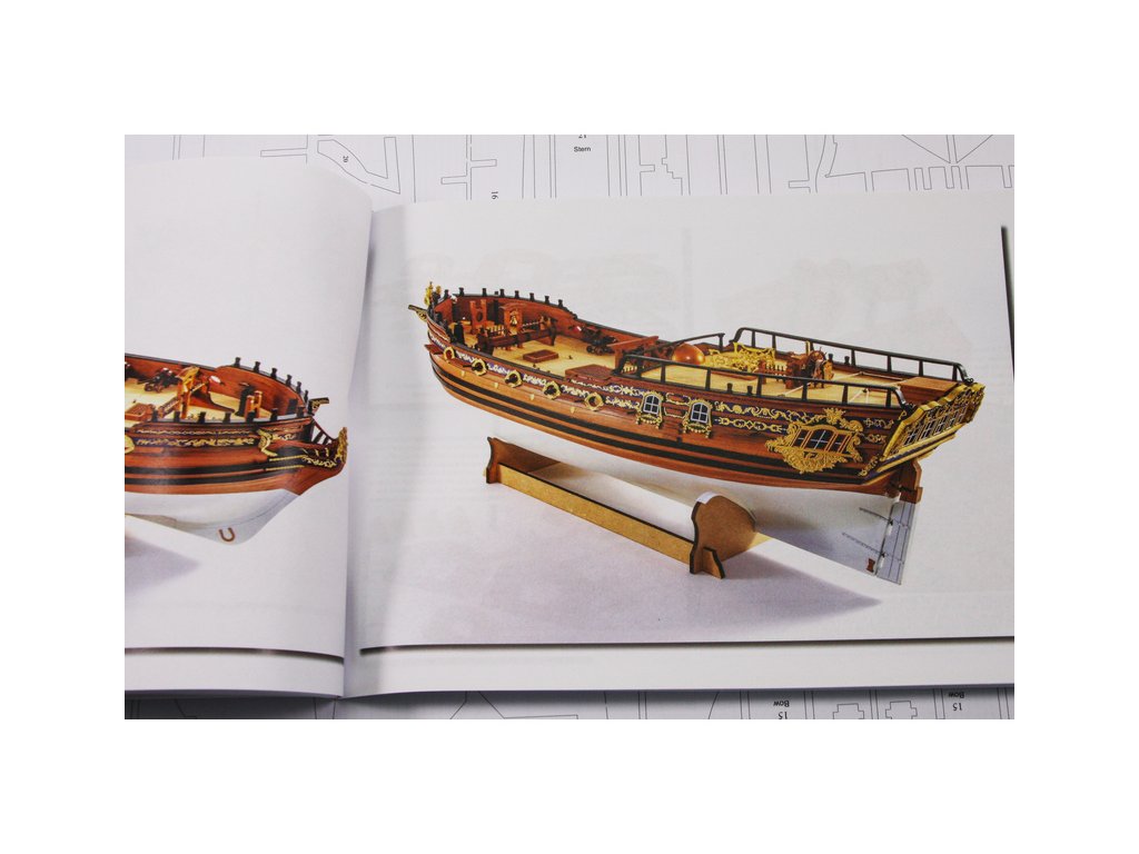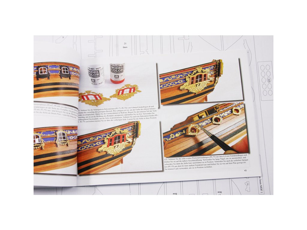 Balení obsahuje laserem řezané dřevěné díly, plaňky, paluby, stožáry, doplňky z pryskyřice, dekorace, mosazné kování, lanoví. Podrobný obrázkový manuál EN a stavební plány.