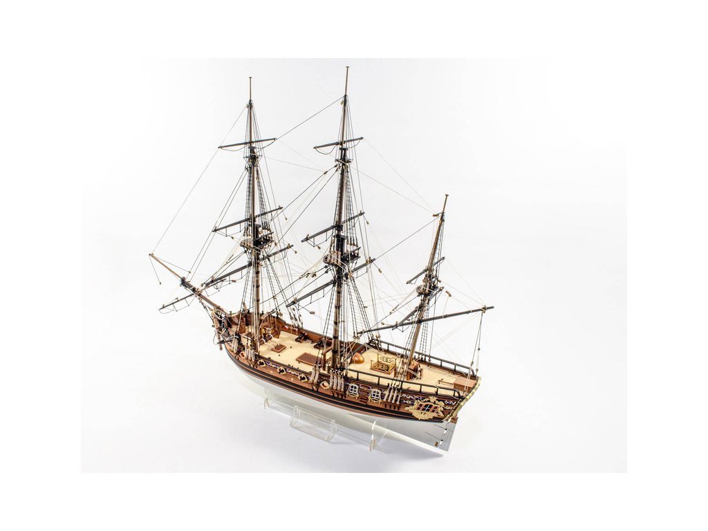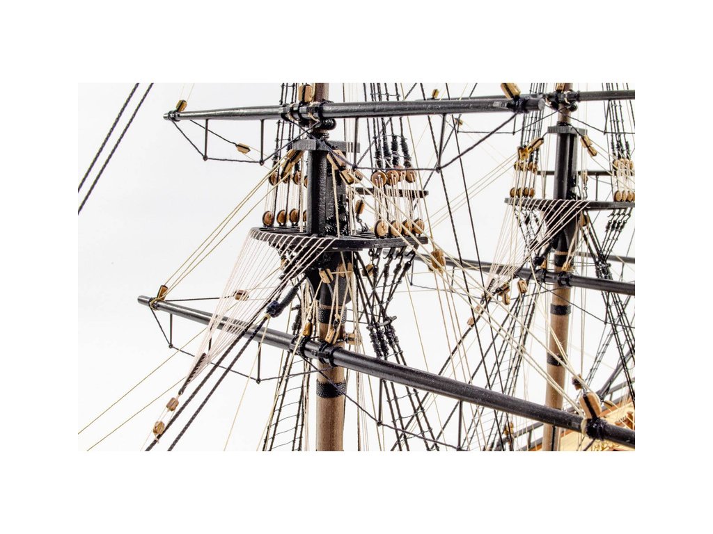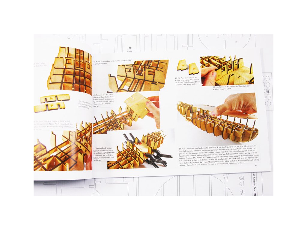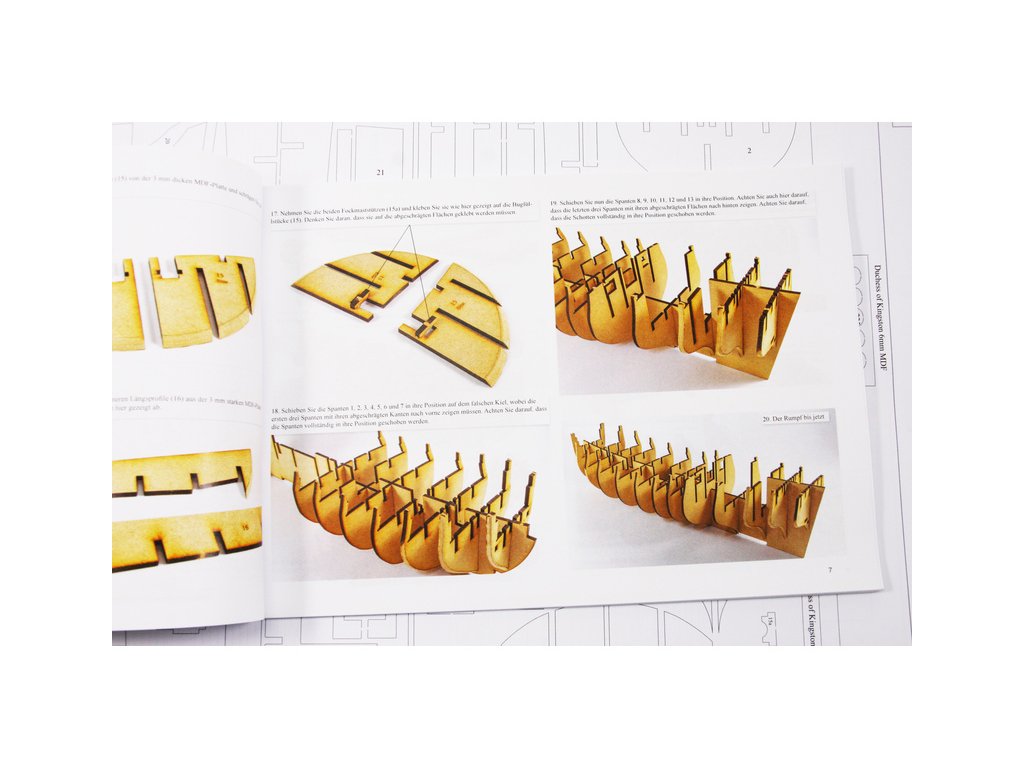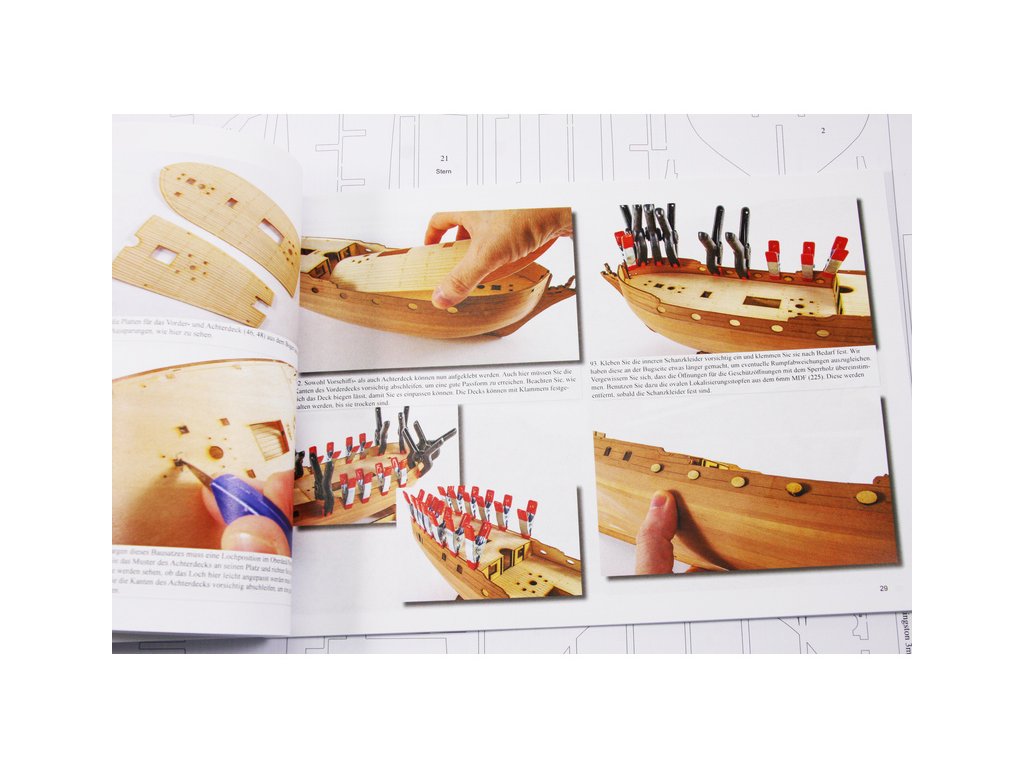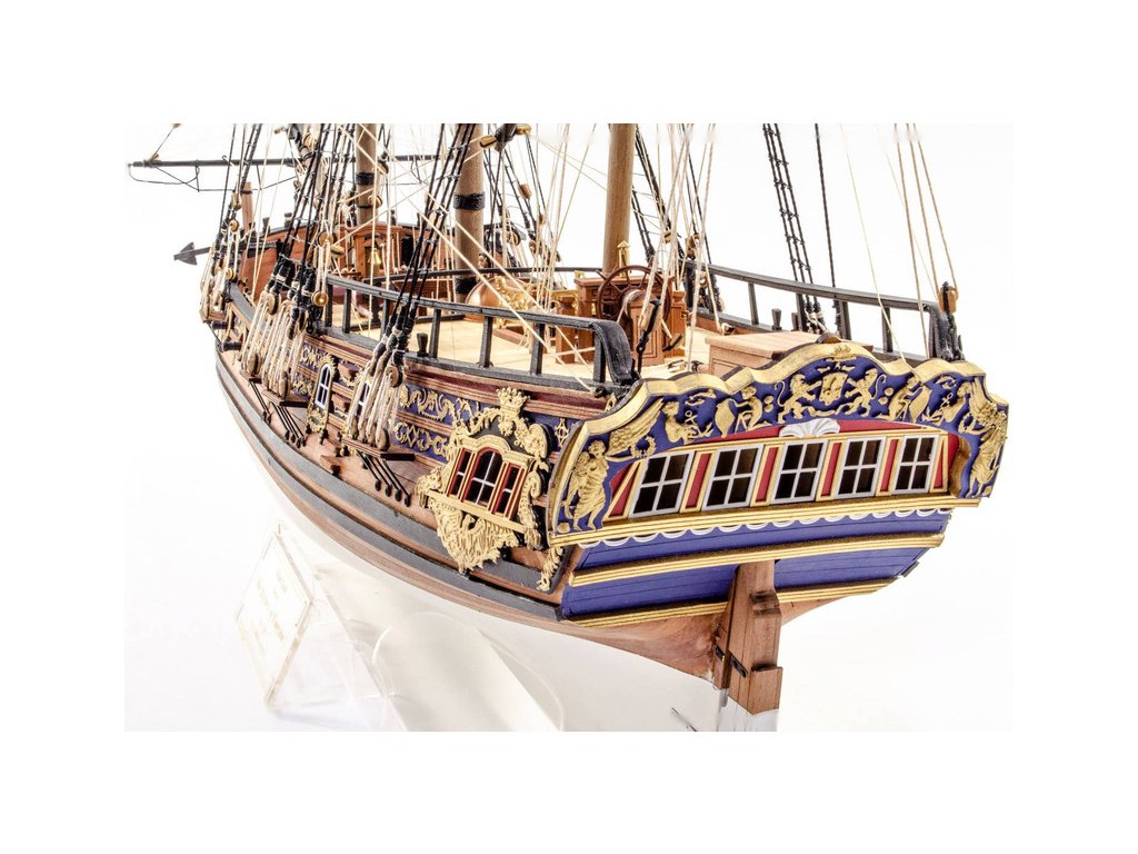 Balení obsahuje laserem řezané dřevěné díly, plaňky, paluby, stožáry, doplňky z pryskyřice, dekorace, mosazné kování, lanoví. Podrobný obrázkový manuál EN a stavební plány.