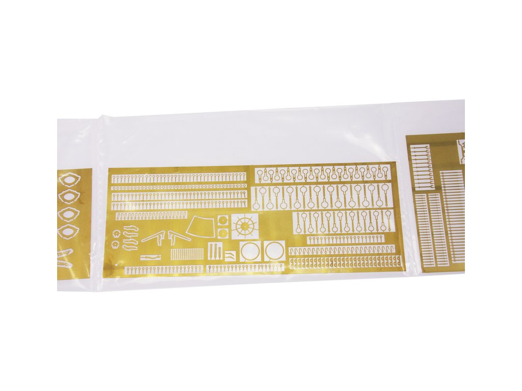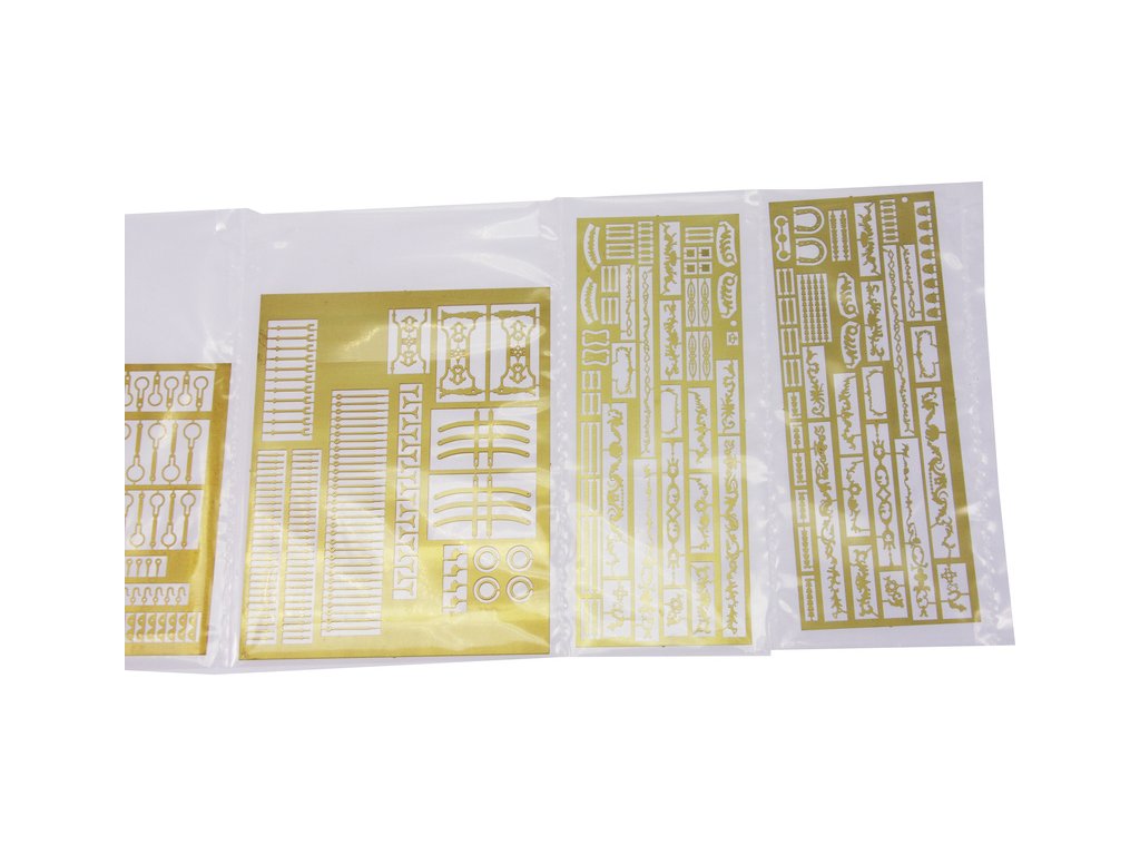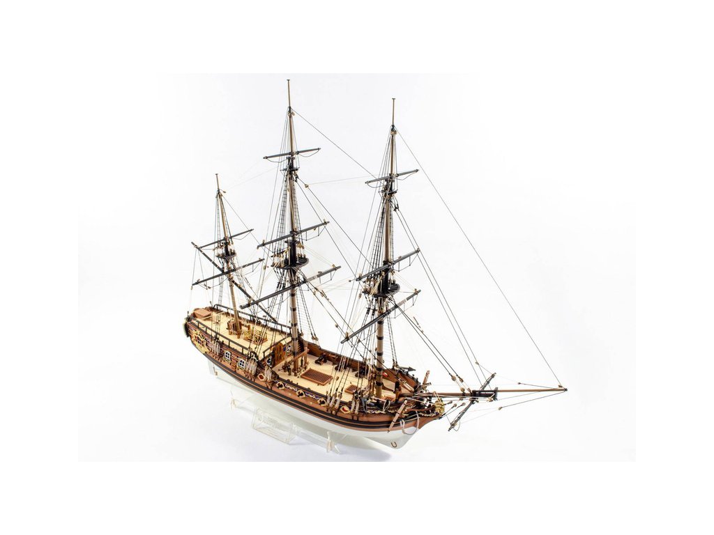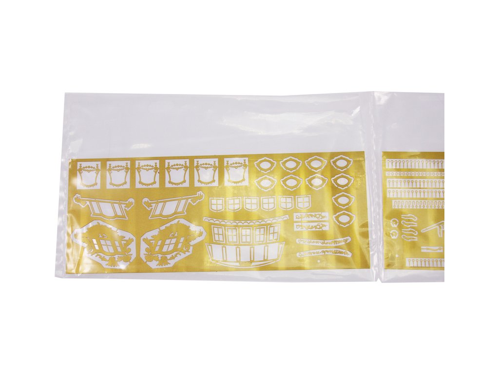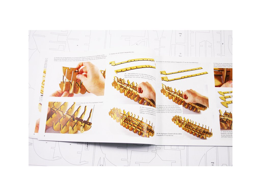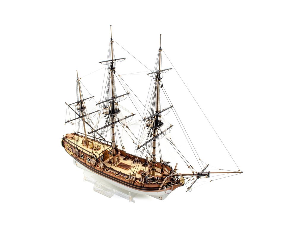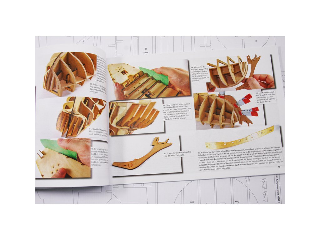 Balení obsahuje laserem řezané dřevěné díly, plaňky, paluby, stožáry, doplňky z pryskyřice, dekorace, mosazné kování, lanoví. Podrobný obrázkový manuál EN a stavební plány.