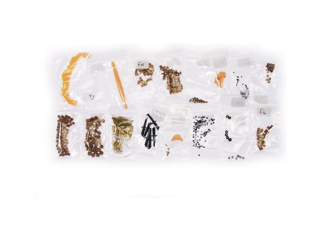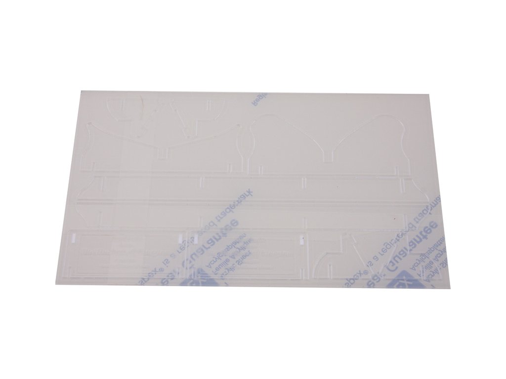 - Laserem řezané díly z MDF a čirého acetátu. Všechny viditelné části jsou vyřezány laserem do plátů z hruškového dřeva