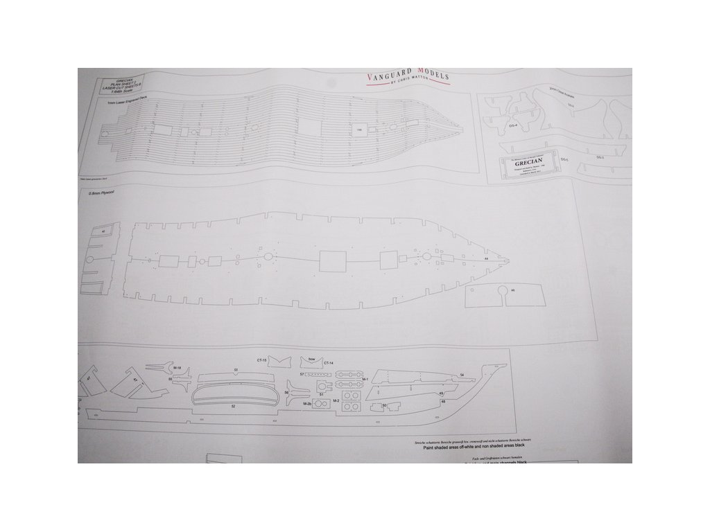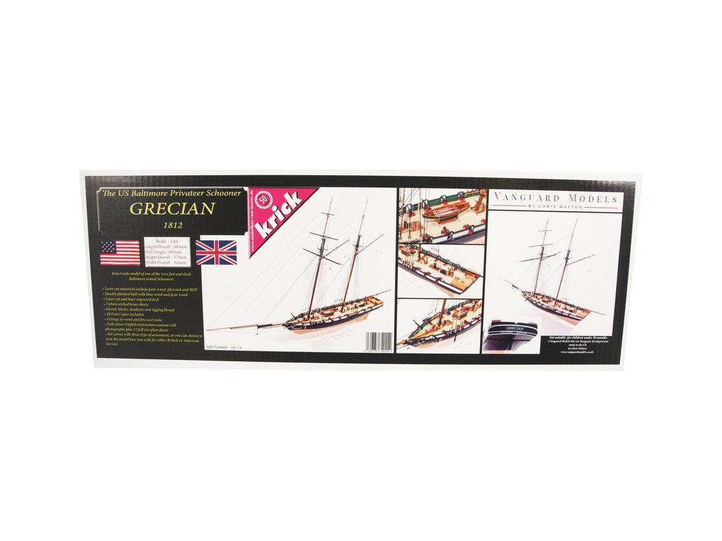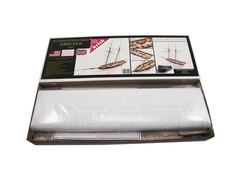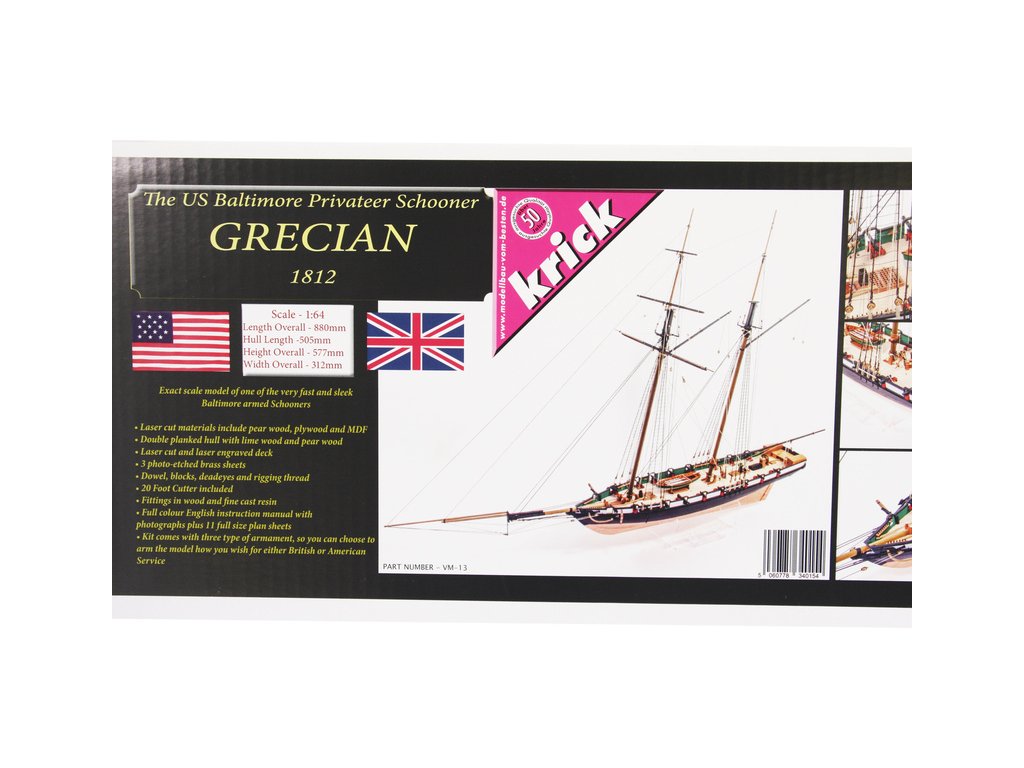 Stavebnice neplovoucího modelu lodi amerického škuneru Grecian z roku 1813 v měřítku 1:64. Pro zkušené modeláře. Dřevěný trup z laserem vyřezaných dílů, součástí je stavební plán, autentické detaily. Komplexní, barevný návod k použití spolu s 11 plány.