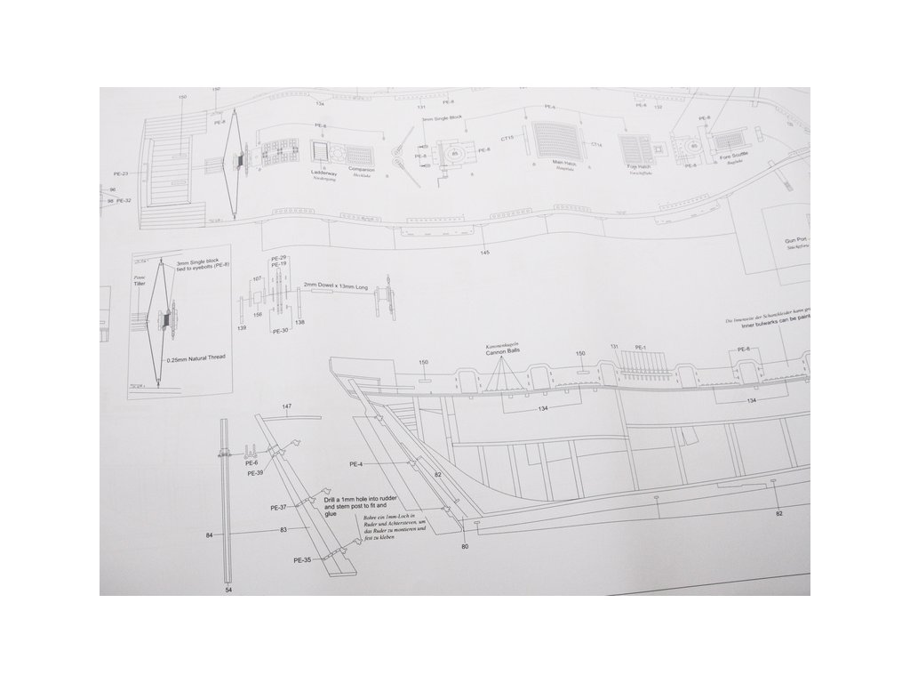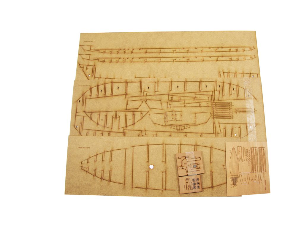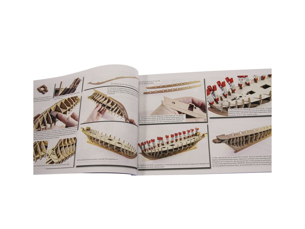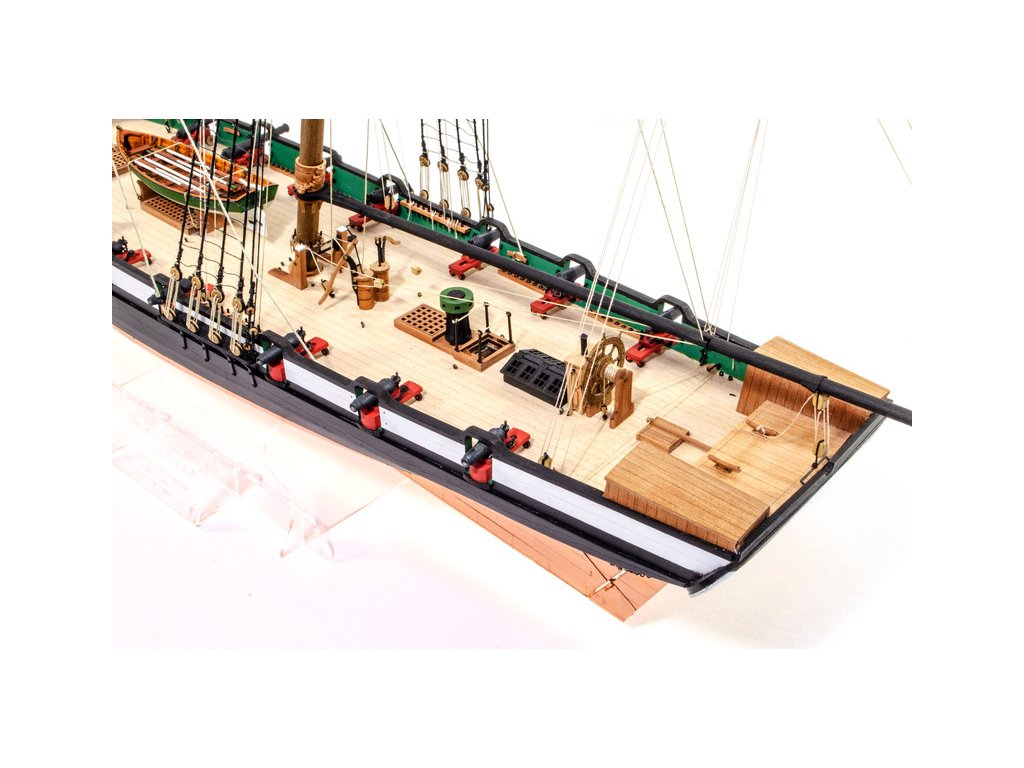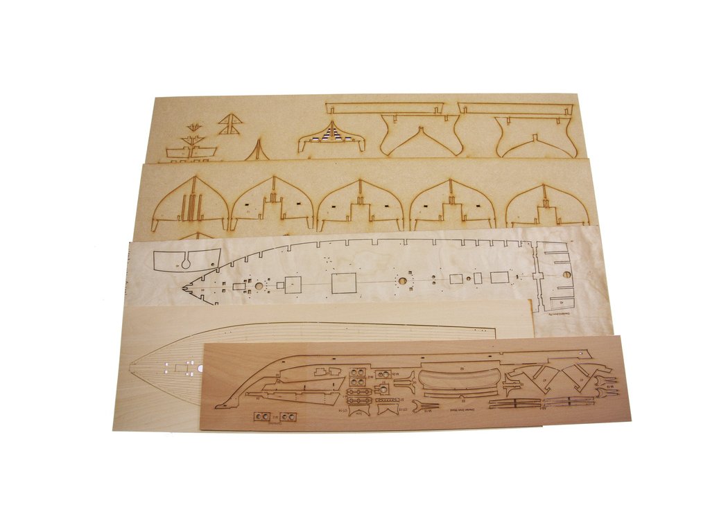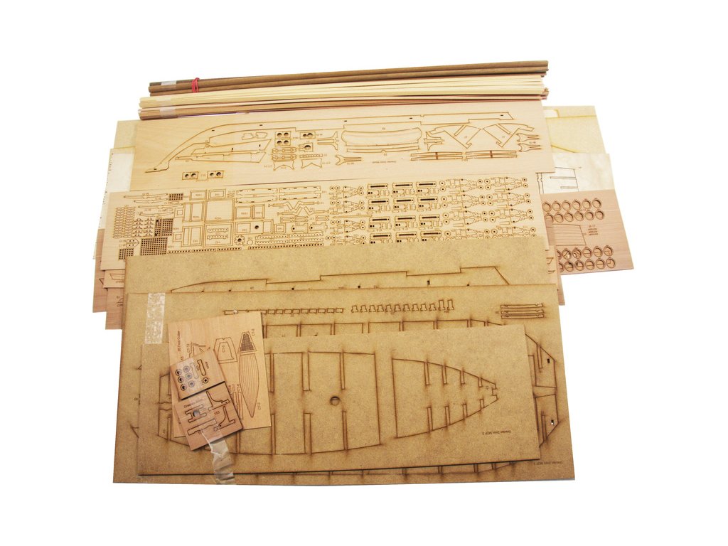 Balení obsahuje laserem řezané a gravírované díly vyrobené z MDF a hruškového dřeva, laserem gravírovaná a řezaná deska z lipového dřeva s detaily, 3 destičky vyrobené z fotoleptaných mosazných dílů, 3D tištěné díly s vysokým rozlišením, dvouplaňkový trup je z lipového dřeva pro první a hruškového dřeva pro druhé prkna obšívky, kulaté lišty z ořechového dřeva pro stěženě, ráhna a výložník. Několik velikostí černě a přírodně zbarvené nitě pro lanoví, stejně jako všechny potřebné součásti. Komplexní, barevný návod k použití spolu s 11 plánky obsahujícími všechny výkresy stěžně a lanoví - manuál EN