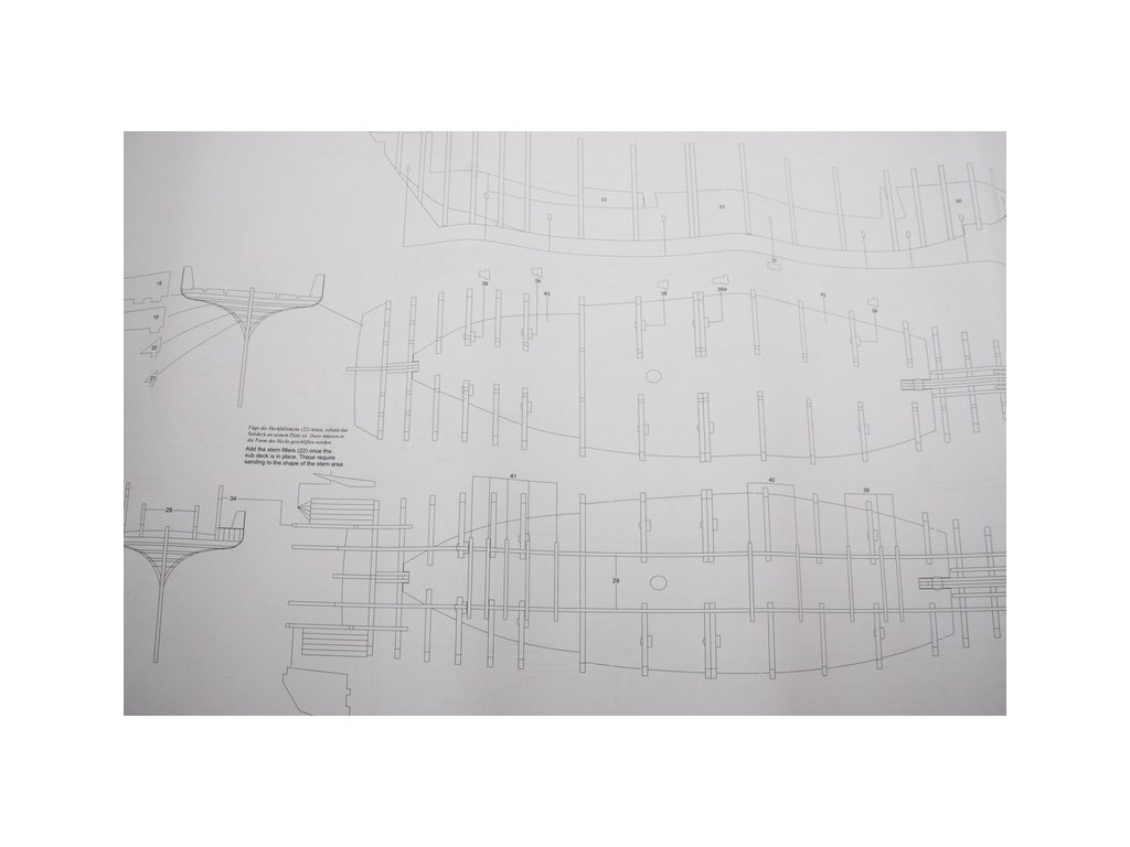 Po otevření víka krabice naleznete dřevěné díly modelu z překližky, lišty, drobné součásti uzavřené v sáčcích, mosazné lepty, motouzy na lanoví, sadu výkresů a manuál.