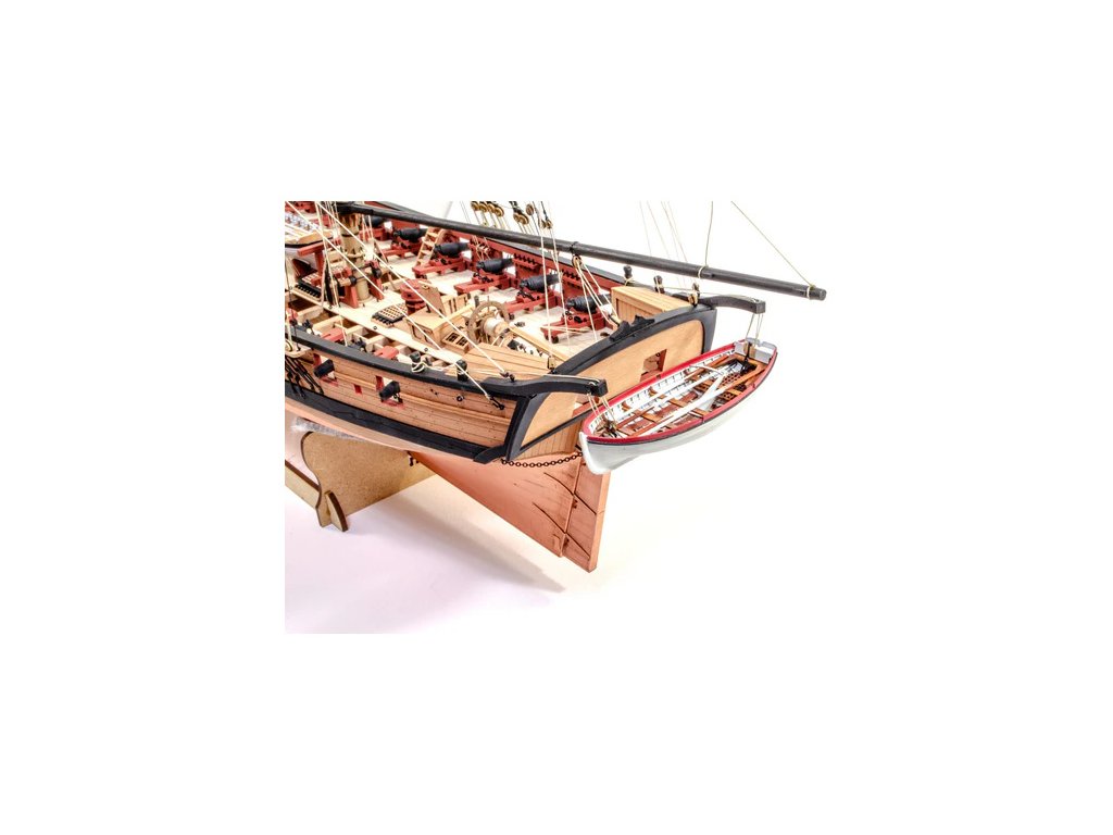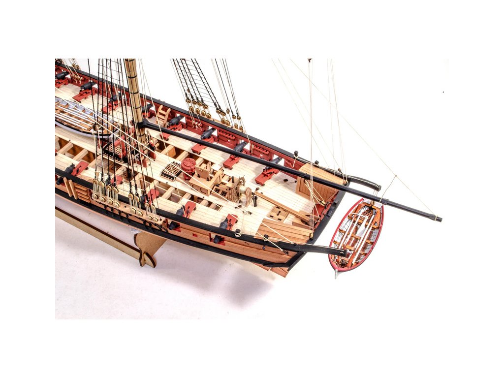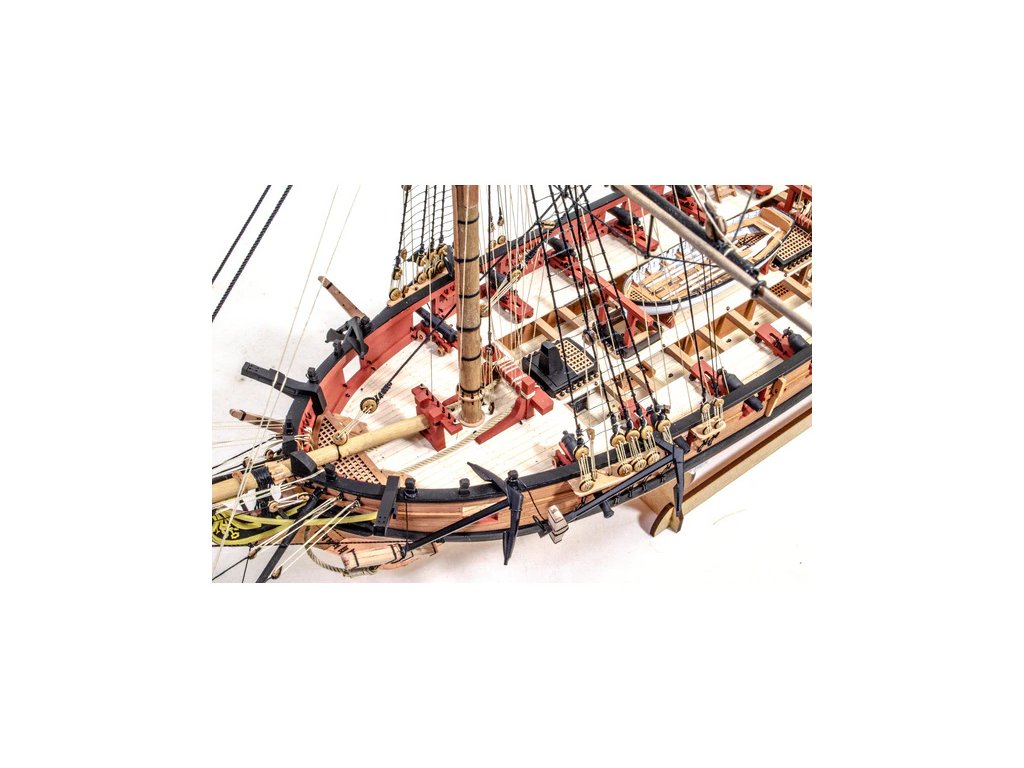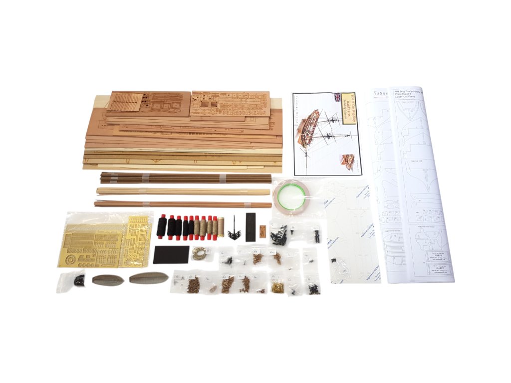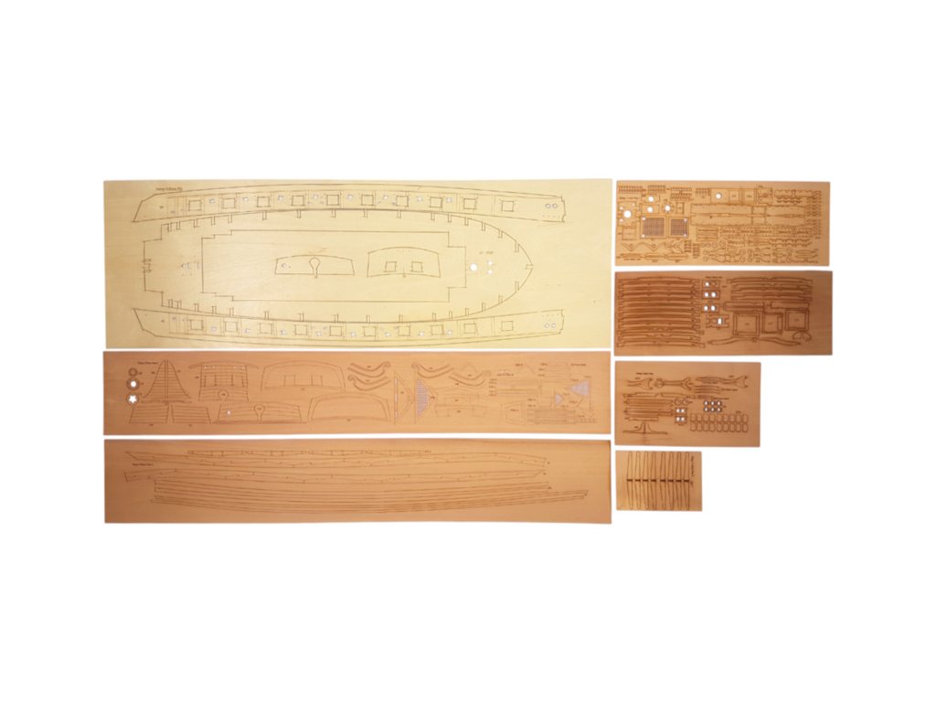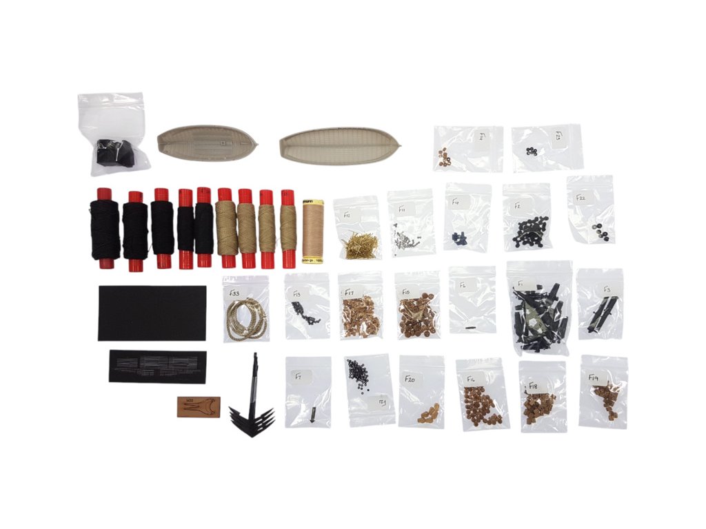 Balení obsahuje laserem řezané a gravírované díly vyrobené z MDF a hruškového dřeva, lišty z lipového a hruškového dřeva (druhá obšívka), laserově řezaná a gravírovaná paluba, 3 mosazné destičky s fotoleptanými díly, stožáry, kladky, oka a lana na lanoví, komponenty ze dřeva a 3D tisku, měděná páska, stojánek a další díly. Komplexní, barevný návod k použití spolu s 16 výkresy modelu v měřítku a detaily na formátu A1 - manuál EN.