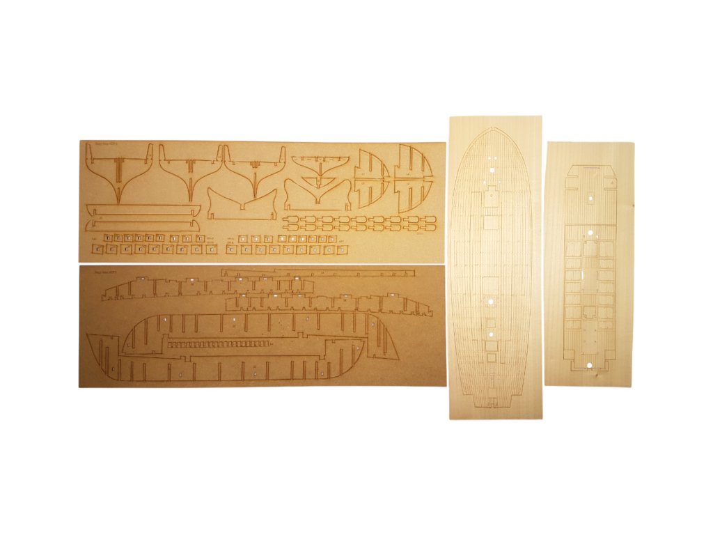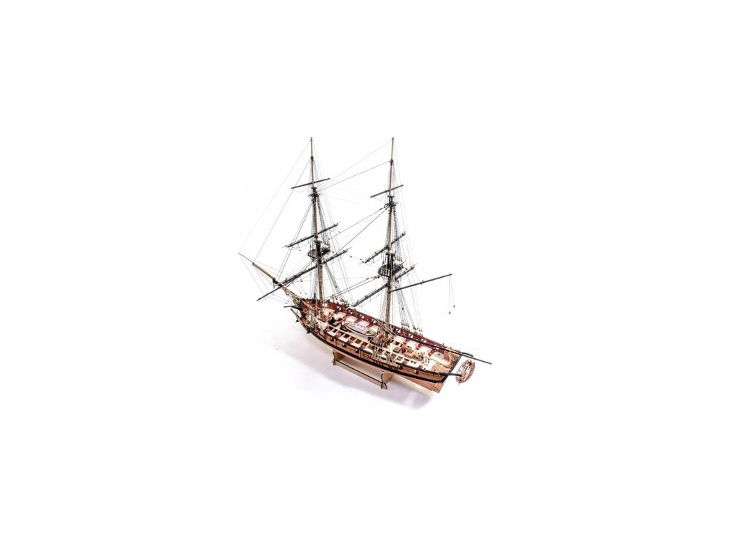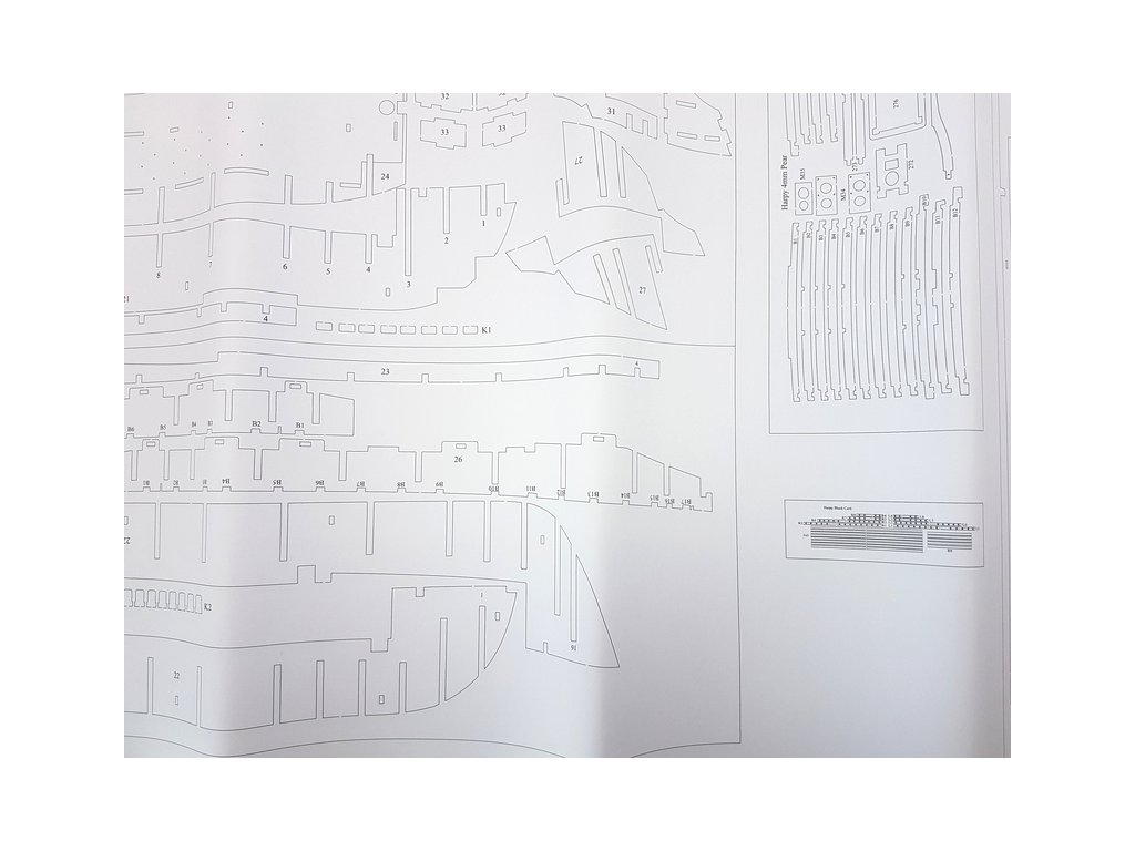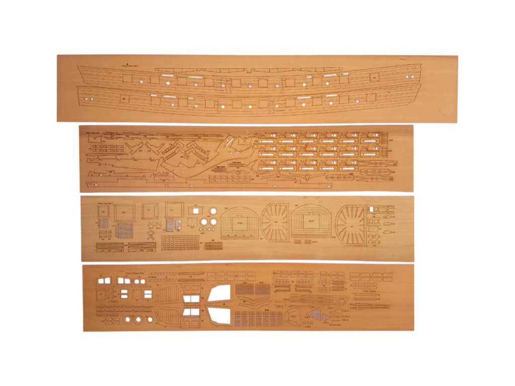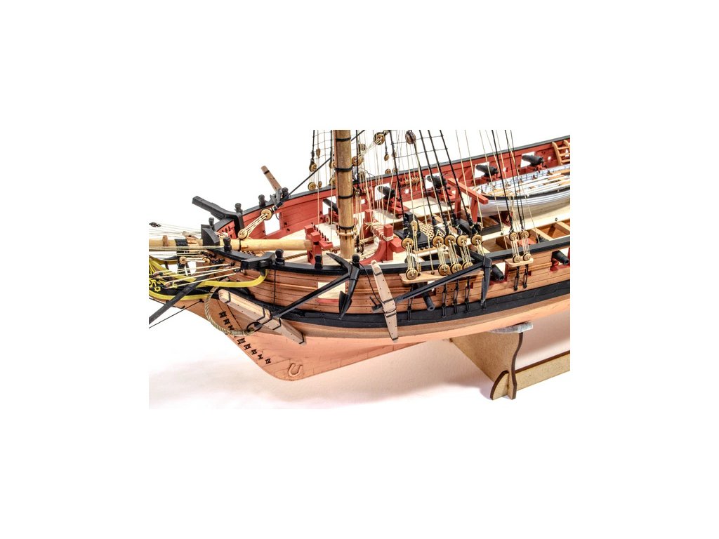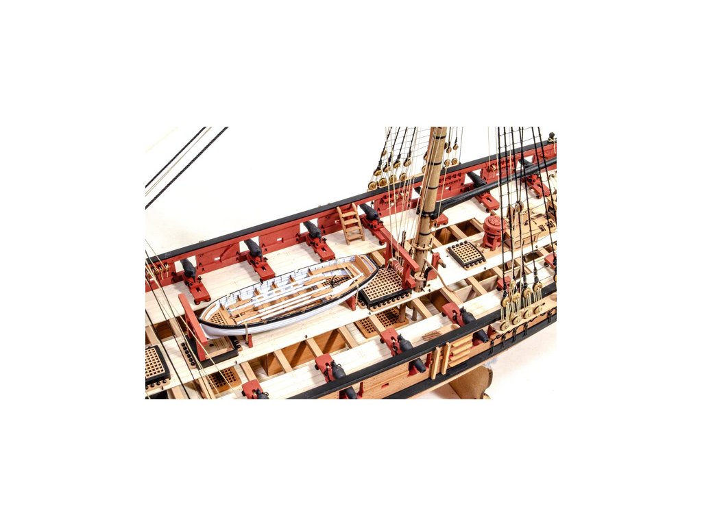 Balení obsahuje laserem řezané a gravírované díly vyrobené z MDF a hruškového dřeva, lišty z lipového a hruškového dřeva (druhá obšívka), laserově řezaná a gravírovaná paluba, 3 mosazné destičky s fotoleptanými díly, stožáry, kladky, oka a lana na lanoví, komponenty ze dřeva a 3D tisku, měděná páska, stojánek a další díly. Komplexní, barevný návod k použití spolu s 16 výkresy modelu v měřítku a detaily na formátu A1 - manuál EN.