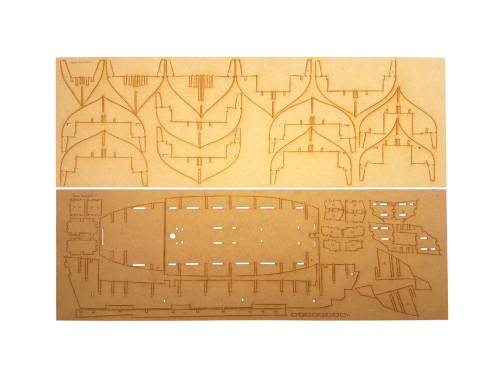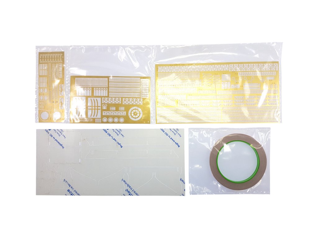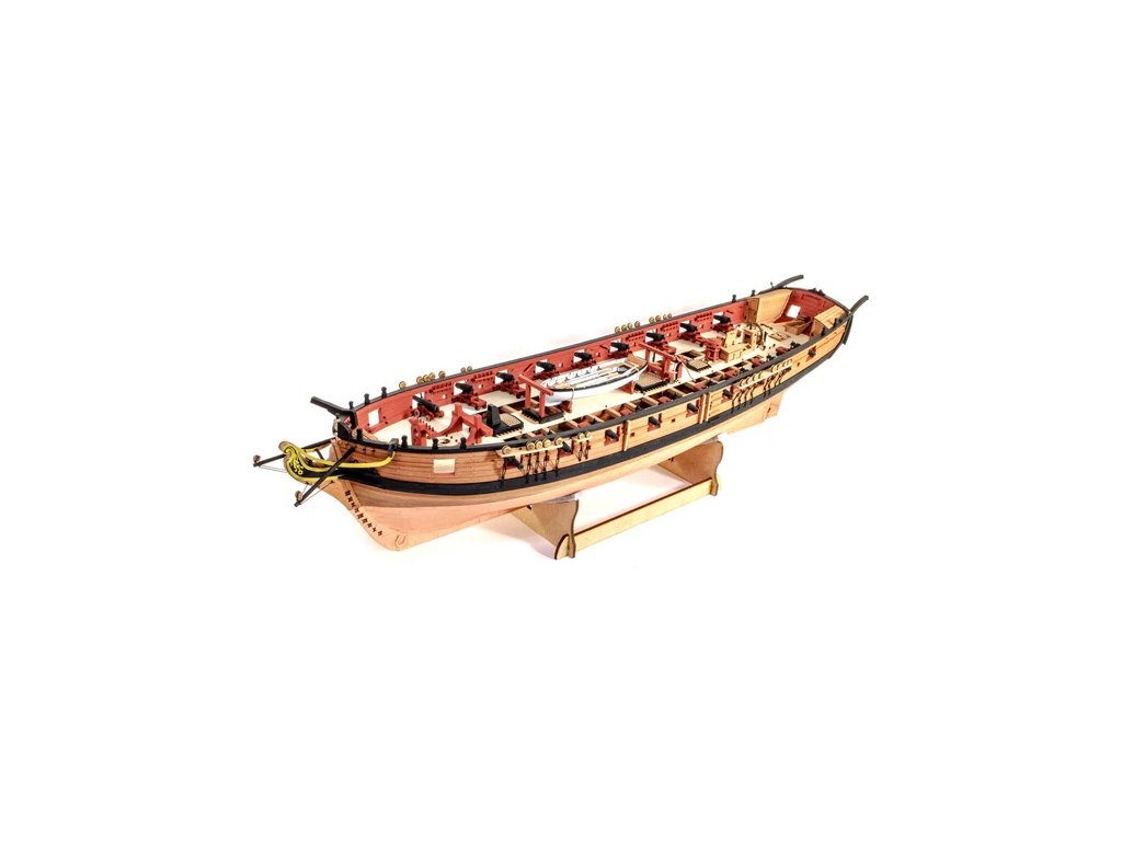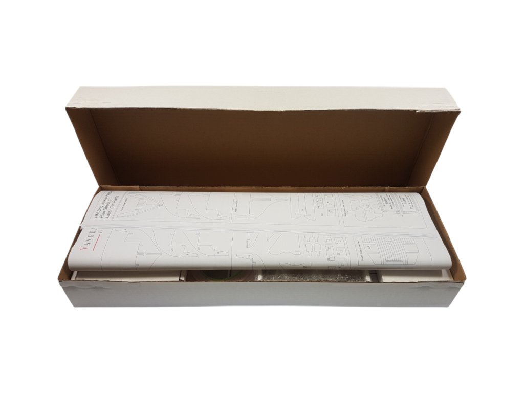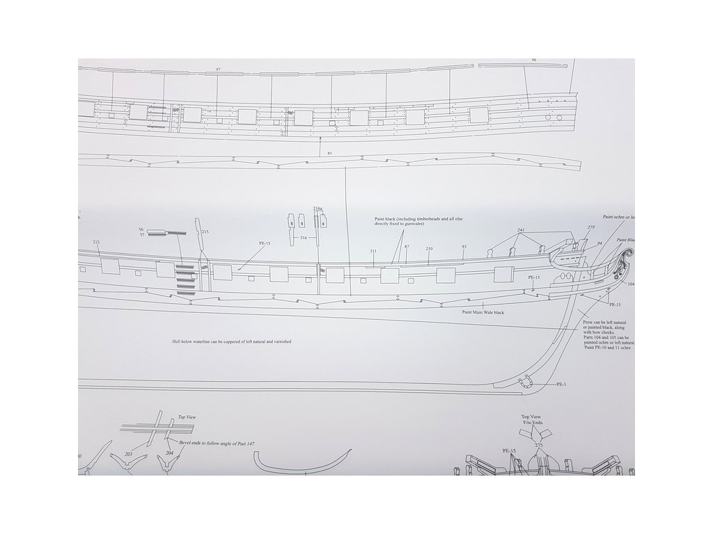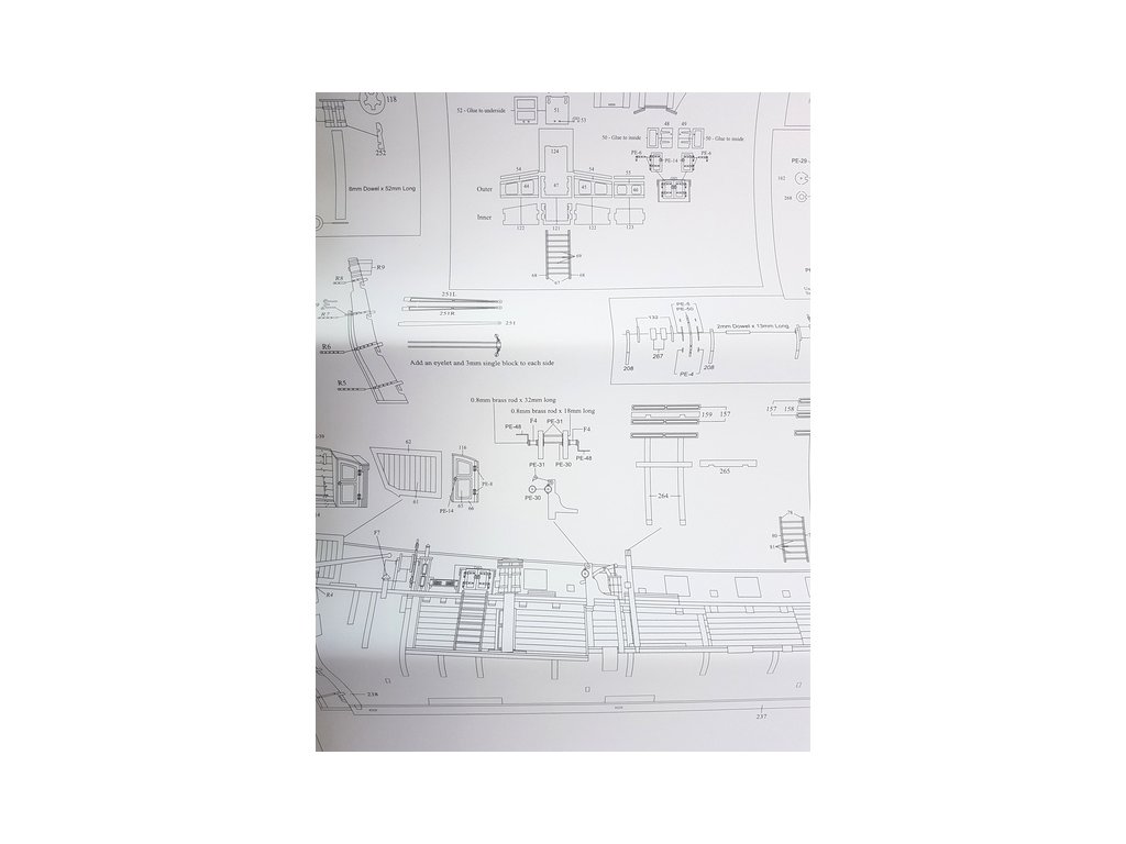Balení obsahuje laserem řezané a gravírované díly vyrobené z MDF a hruškového dřeva, lišty z lipového a hruškového dřeva (druhá obšívka), laserově řezaná a gravírovaná paluba, 3 mosazné destičky s fotoleptanými díly, stožáry, kladky, oka a lana na lanoví, komponenty ze dřeva a 3D tisku, měděná páska, stojánek a další díly. Komplexní, barevný návod k použití spolu s 16 výkresy modelu v měřítku a detaily na formátu A1 - manuál EN.