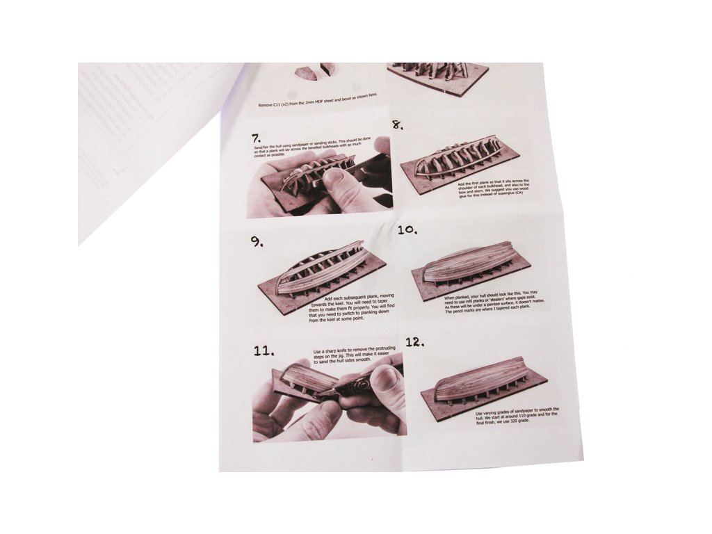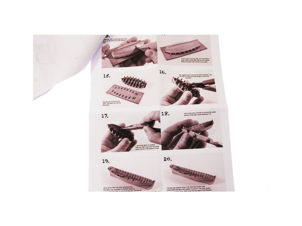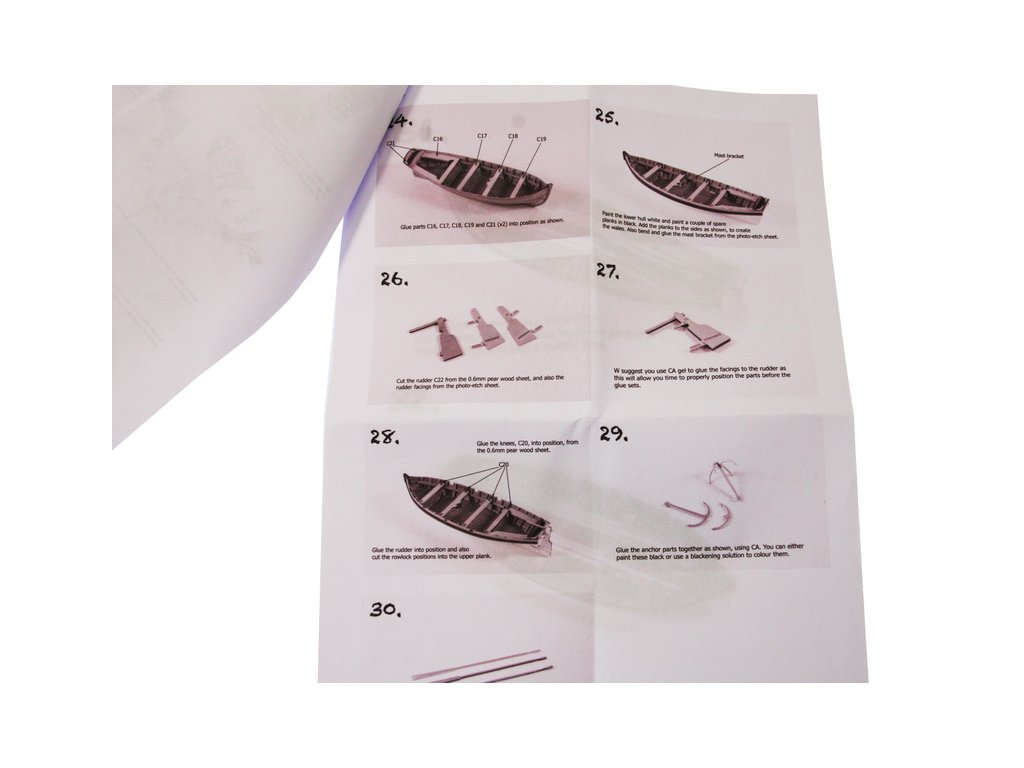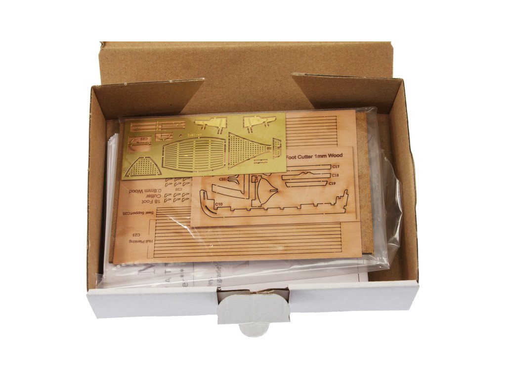 Balení obsahuje sadu překližkových dílů, díly z mosazi, stavební desku s výřezy pro stavbu kýlu a kostry a manuál EN.