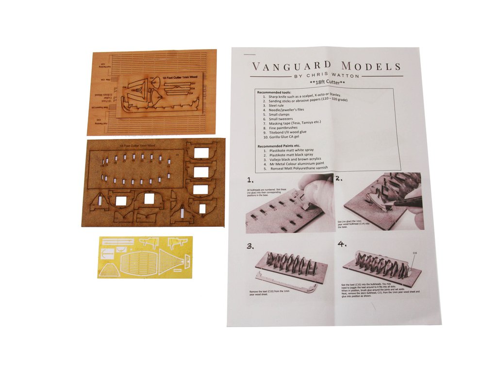 Stavebnice modelu lodi Vanguard Models - Kutter člun v měřítku 1:64. Délka modelu lodi je 86mm, stavba převážně ze dřeva s drobnými doplňky, součástí je i stavební plán. Obrazový manuál krok za krokem