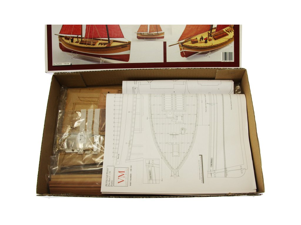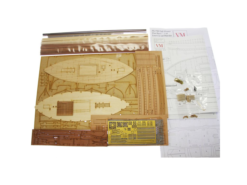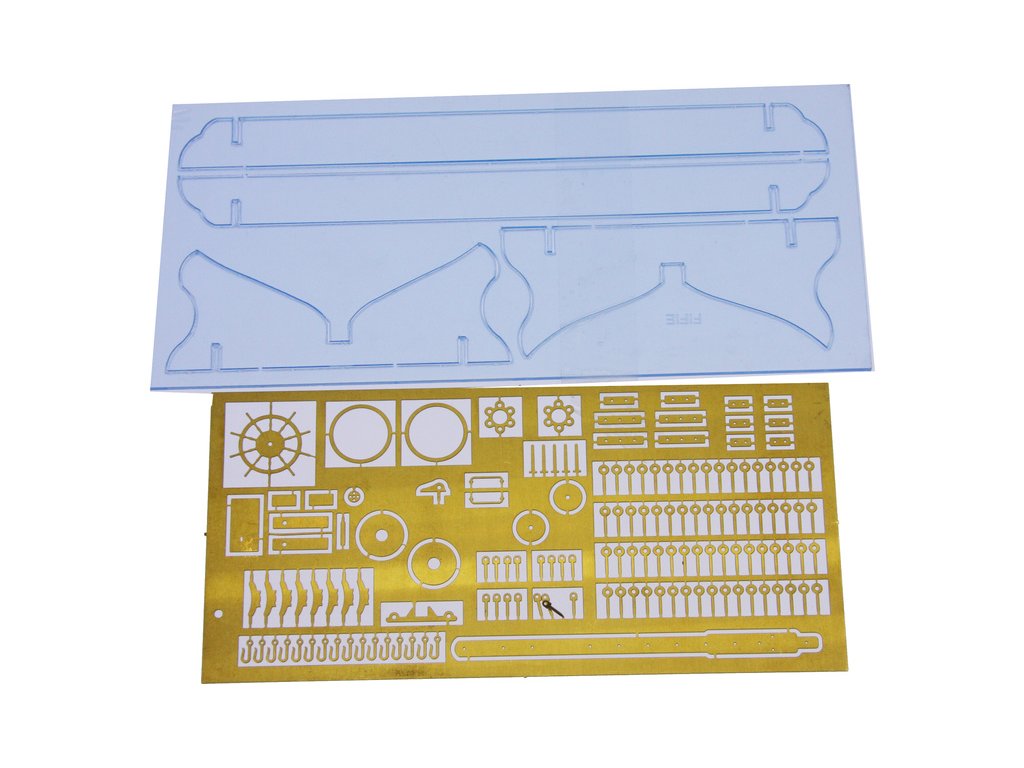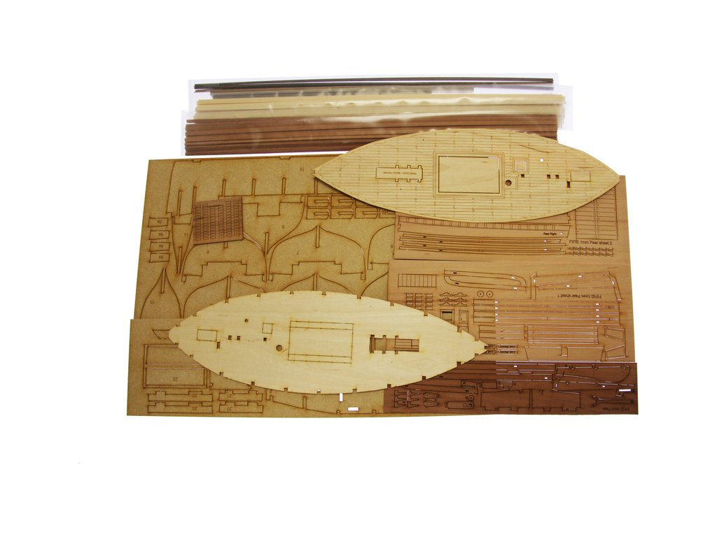 Balení obsahuje sadu překližkových dílů, sadu dřevěných lišt o různém průřezu, sáčky s drobnými díly, díly z mosazi, sadu výkresů a manuál EN.