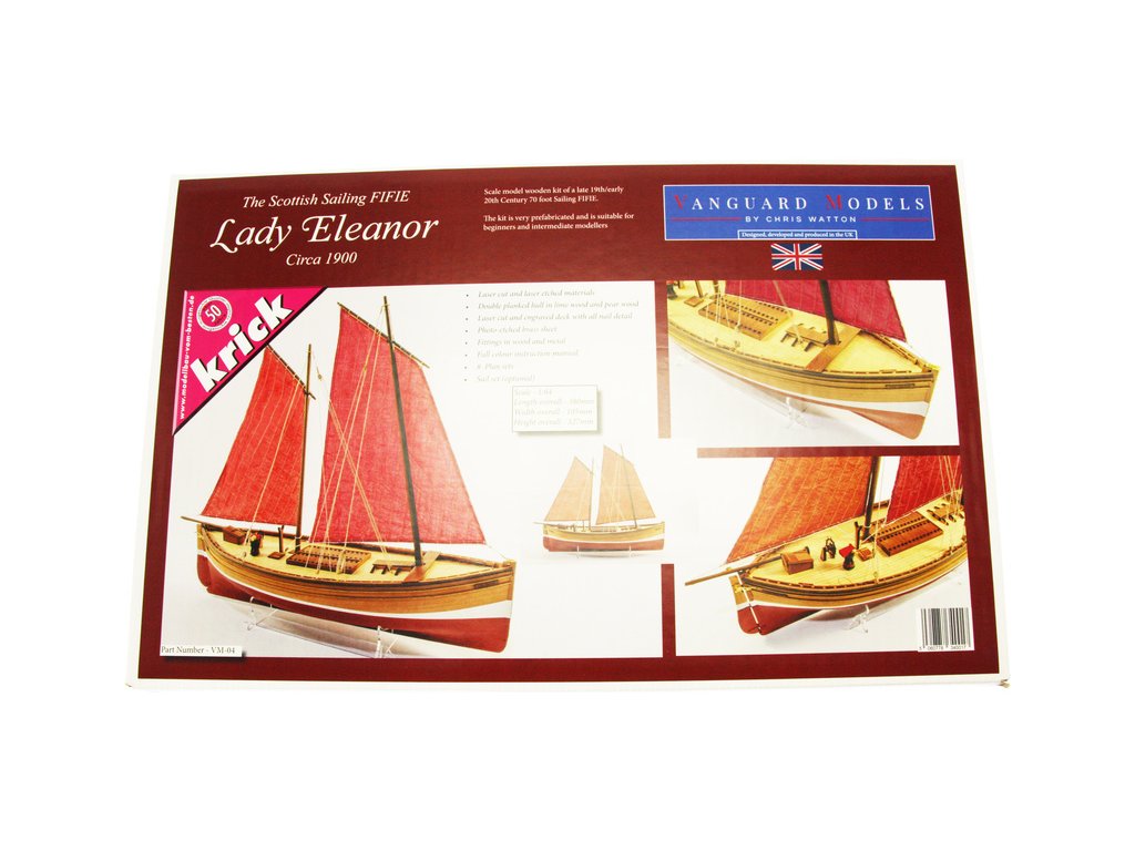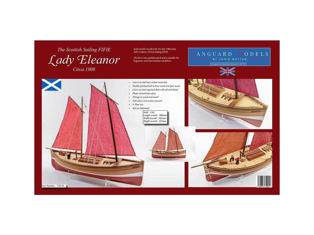 Stavebnice modelu lodi Vanguard Models Lady Eleanor 1850 v měřítku 1:64. Délka modelu lodi je 380mm, stavba převážně ze dřeva s drobnými doplňky, součástí je i stavební plán. Laserem řezané díly, kovové součásti.