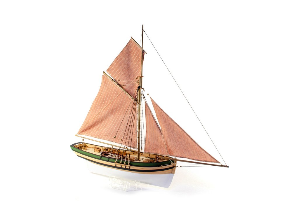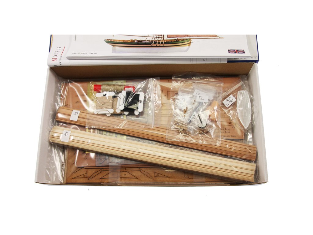 Balení obsahuje sadu překližkových dílů, sadu dřevěných lišt o různém průřezu, sáčky s drobnými díly, díly z mosazi, lanoví, sadu výkresů a vícejazyčný manuál EN.