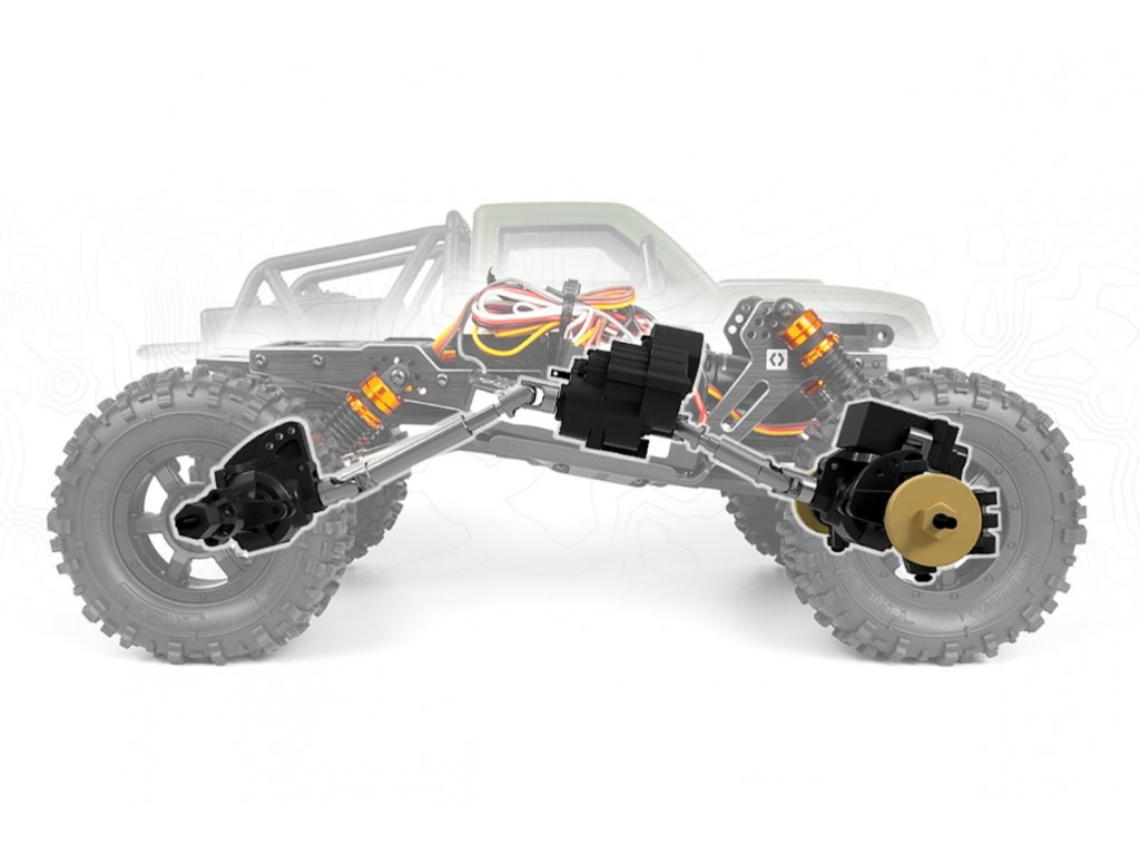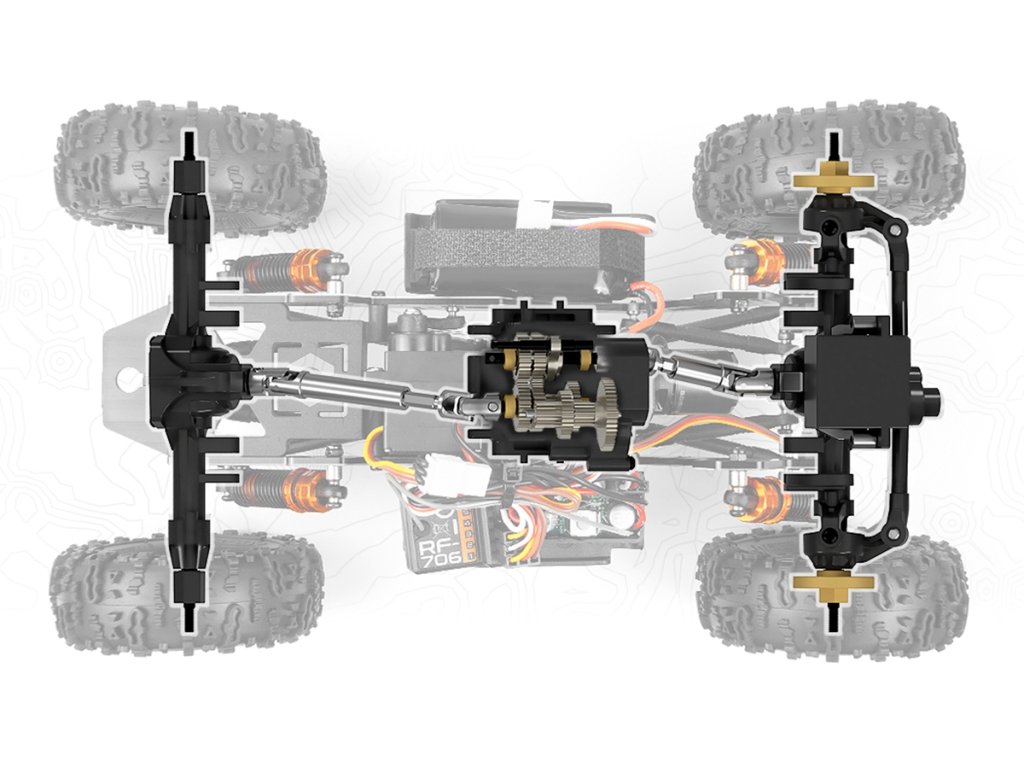 Pevný 2mm hliníkový podvozek, centrální servem ovládaná převodovka half-DIG, vyhlazená spodní strana, přední převodovka s overdrive a přidané nízko namontované mosazné komponenty společně poskytují působivou ovladatelnost a trakci v kompaktním balení.