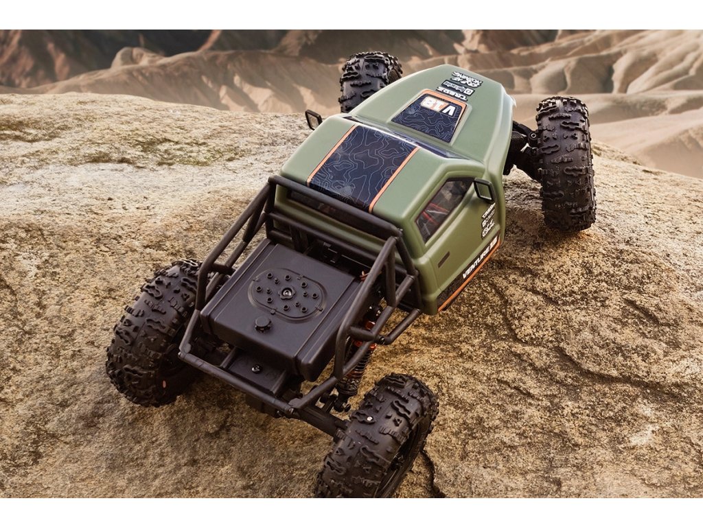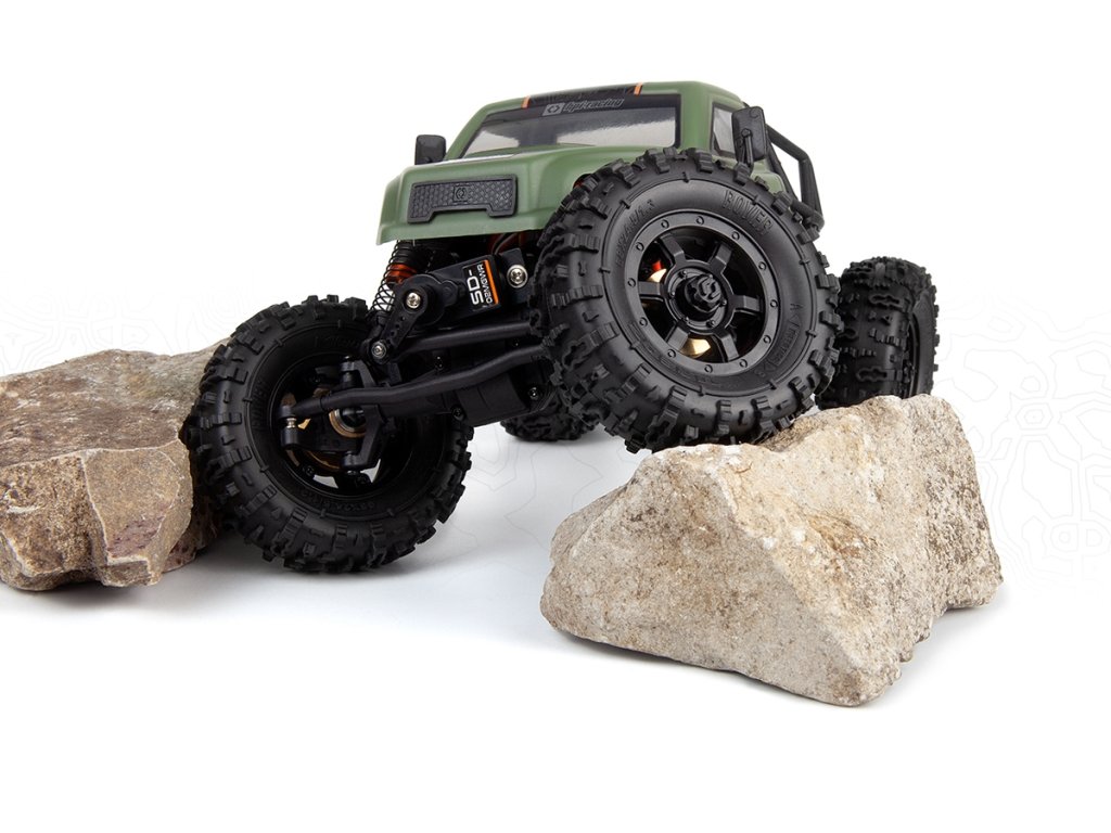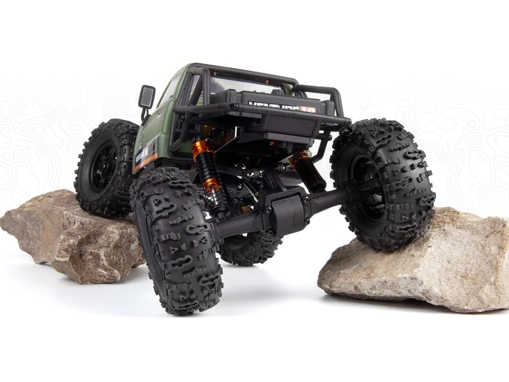 V kombinaci s detailní karoserií Ridgeline Half Cab a pneumatikami ROVER 1,3" Pink Dot je připraven čelit technicky náročnému terénu ihned po vybalení. Bezsponková karoserie z polykarbonátu je předem lakovaná v barvě matné zelené nebo gunmetalové šedé podle vašeho výběru a má průhledná okna, detailní mřížku chladiče, funkční zrcátka a trubkový rám se zadní nádrží.
