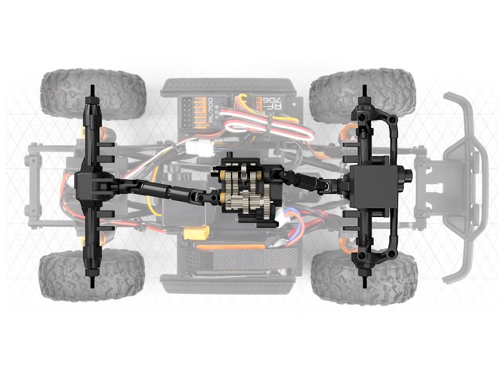 Nízký převod se může pochlubit působivým převodovým poměrem 81,44:1, který poskytuje výjimečné schopnosti při pomalém průchodu na úzkých, technických stezkách a překážkách. A když na rovném, otevřeném úseku potřebujete přidat na rychlosti - nebo prostě jen potřebujete vysoký výkon, abyste se dostali do stoupání - stačí na vysílači přeřadit na vysoký převod, čímž získáte převodový poměr 20,36:1, který vám nabídne pořádnou rychlost.
