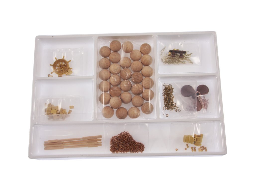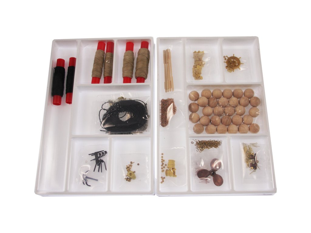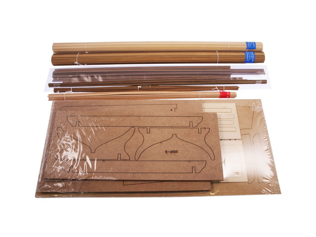 Balení obsahuje sadu překližkových dílů, sadu dřevěných lišt o různém průřezu, blistr s drobnými díly, sadu výkresů a vícejazyčný manuál.