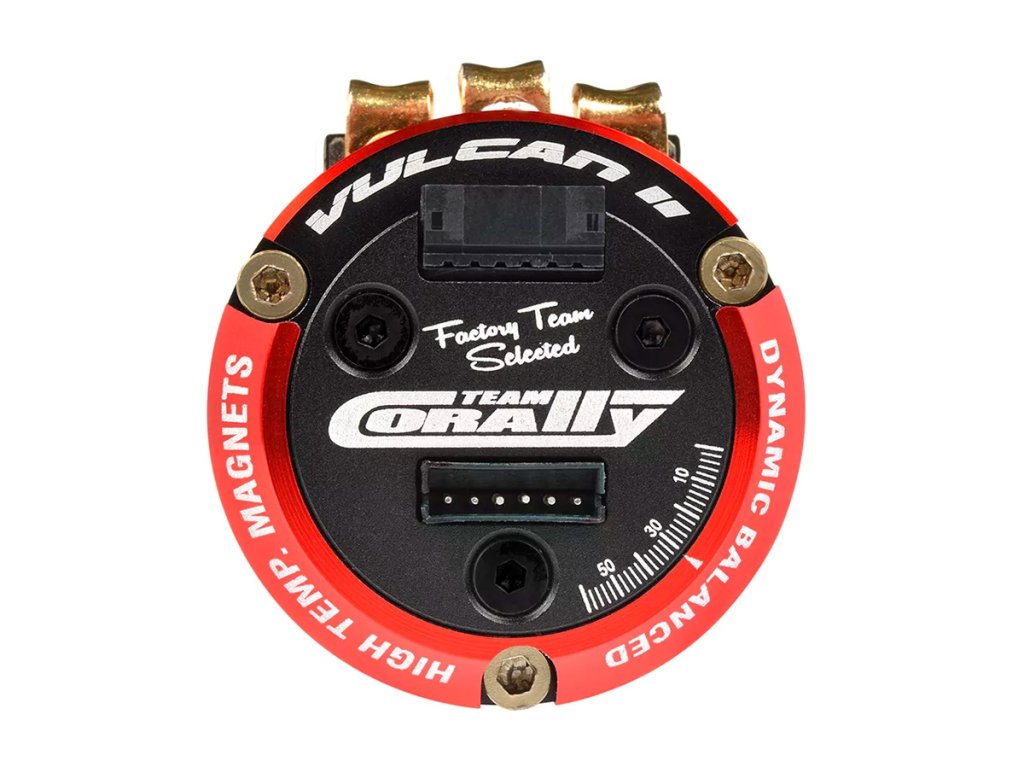 TEAM CORALLY VULCAN 2 střídavý motor. Provozní napětí: 1S-2S, délka samotného těla 52,0mm, průměr: 35,8mm, váha: 165g, otáčky na 1Volt: 9.350 o/min, hřídel 3,17mm, Výkon: 610W, Rotor: 12,3mm. EFRA, IFMAR, ROAR, BRCA, DMC regulérníDoplňkové parametry