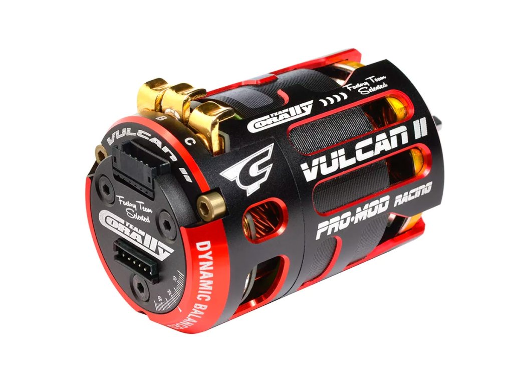 TEAM CORALLY VULCAN 2 střídavý motor. Provozní napětí: 1S-2S, délka samotného těla 52,0mm, průměr: 35,8mm, váha: 165g, otáčky na 1Volt: 8.170 o/min, hřídel 3,17mm, Výkon: 495W, Rotor: 12,3mm. EFRA, IFMAR, ROAR, BRCA, DMC regulérníDoplňkové parametry