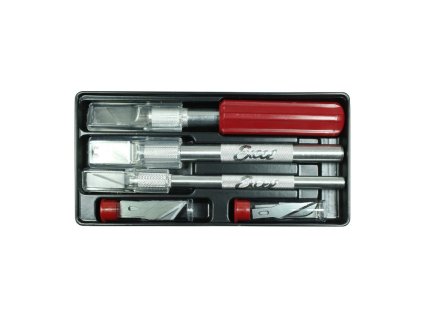 Sada obsahuje nože a čepele nejvyšší kvality, vhodné pro řezání, ořezávání a tesání dřeva, plastu, gumy a hlíny. 13 nejrůznějších čepelí a nože K1, K2 a K5 s bezpečnostními kryty.
