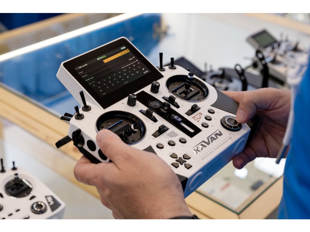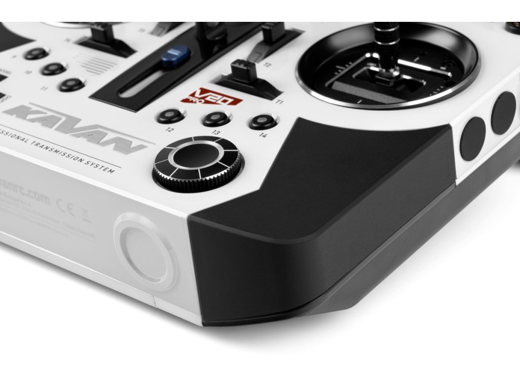 Pro ovládání dalších funkcí slouží 6 třípolohových přepínačů, 2 dvoupolohové (1 momentový) přepínače, 2 postranní otočné ovladače, 6 uživatelsky programovatelných tlačítek (vpředu) a dvě momentová tlačítka (vzadu). Vestavěný 6osý gyroskopický senzor lze nastavit pro ovládání kanálu plynu, řízení výchylek mixu a slouží i pro probuzení displeje. Páčky trimů a knoflíky jsou celokovové, precizně obráběné na CNC. Návrh rozmístění ovladačů a ergonomie těla je výsledkem několika desítek hodin testování a ladění týmem KAVAN.