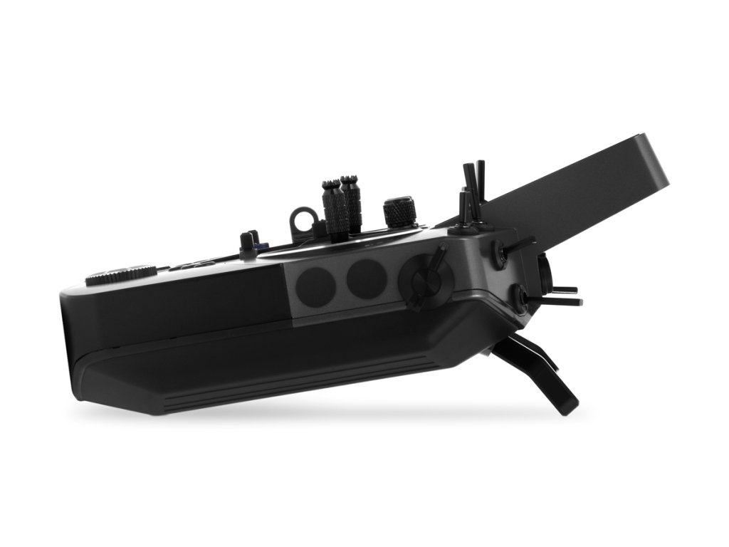 Tělo vysílače je robustní a dokonale padnoucí do ruky. Pogumované gripy na bocích a zadní straně vysílače poskytují pevný pohodlný a jistý úchop. Odtud bez obtíží dosáhnete na všechny ovladače. Gimbaly se nachází těsně u okrajů vysílače. Na komfortní držení vysílače tedy nepotřebujete ani pult. Pro maximální ergonomii lze dokoupit i dlouhé tuningové páky s přepínači. Křížové ovladače můžete natočit až o 8° a omezit rozsah jejich chodu na 45–60°. Samozřejmě nechybí ani možnost nastavení síly neutralizačních pružin a aretace. Pro změnu módu tak stačí v nabídce nastavení zvolit požadovaný mód, a během několika okamžiků nastavit aretaci páky plynu.