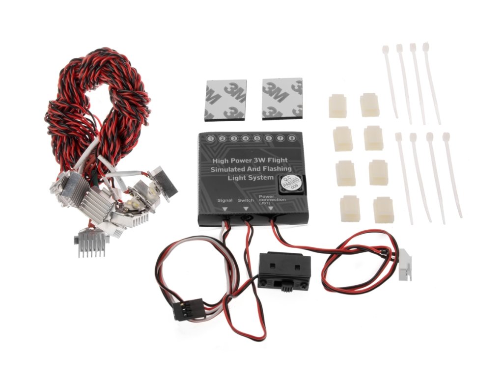 Sada světel s 5mm LED s extra vysokou svítivostí pro RC modely letadel, vrtulníků a multikoptér použitelná i pro lodě; celkem 3W. V základním nastavení simuluje činnost pozičních, antikolizních a přistávacích světel skutečných letadel a vrtulníků – dává tak RC modelu realističtější vzhled. Obsahuje 8 LED světel s extrémně vysokou svítivostí: antikolizní blikající červený maják, 3 bílé zábleskové majáky, červené a zelené poziční světlo, 2 bílá přistávací světla.