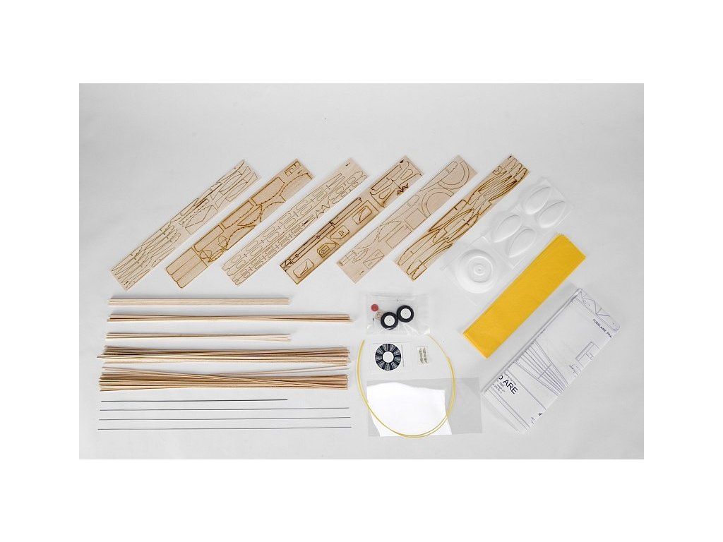Stavebnice obsahuje: balsové laserem vyřezávané díly, balsové nosníky, vakuově lisované díly (kryt motoru...), čirou plastovou fólii na "zasklení" kabiny, ocelovou strunu na podvozek a další drobné díly, lehká pěnová kola, barevný potahový papír, aršík samolepek, stavební plán.