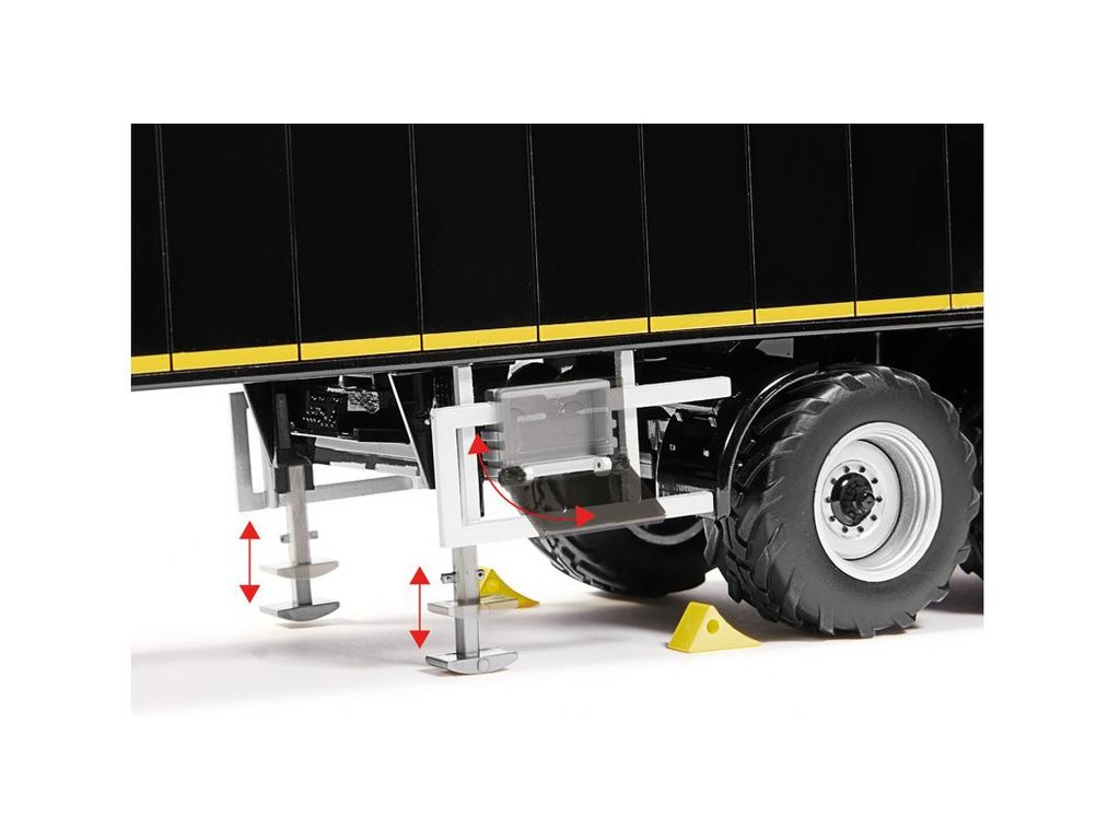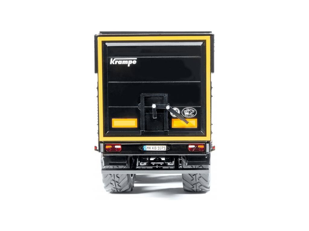 Třínápravový návěs Krampe SB II 30/1070 - černý, v měřítku 1:32 - příslušenství pro kovové modely tahačů Wiking 1:32. Obsahuje funkční odpružení kol se zatáčecí zadní nápravou, otevírací čelo s otvorem pro jemné dávkování, výsuvné stojky, gumová kola a klíny kol. Kvalitní zpracování z kovu a plastu.