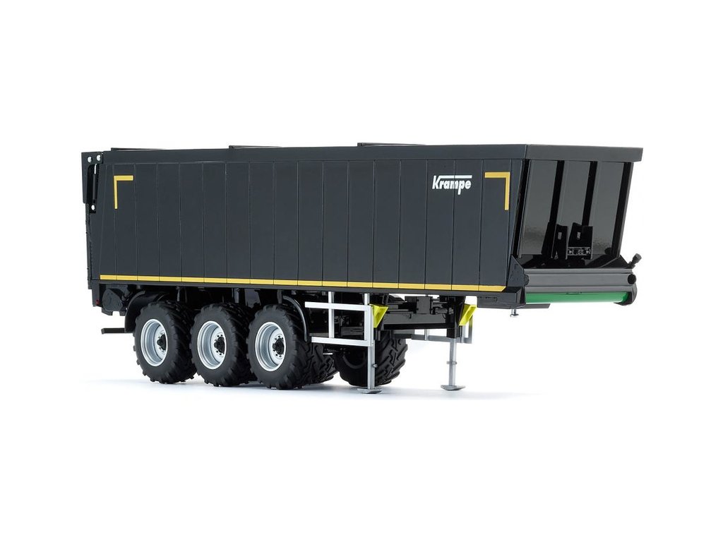 Třínápravový návěs Krampe SB II 30/1070 - černý, v měřítku 1:32. - příslušenství pro kovové modely tahačů Wiking 1:32. Obsahuje funkční odpružení kol se zatáčecí zadní nápravou, zdvihací nápravu, otevírací čelo s otvorem pro jemné dávkování, výsuvné stojky, gumová kola a klíny kol. Na levé straně je otevírací schránka pro nářadí. Kvalitní zpracování z kovu a plastu.