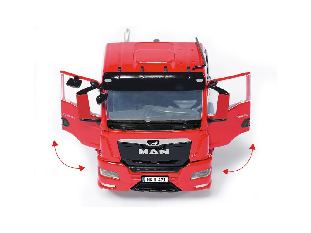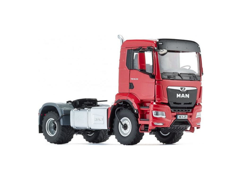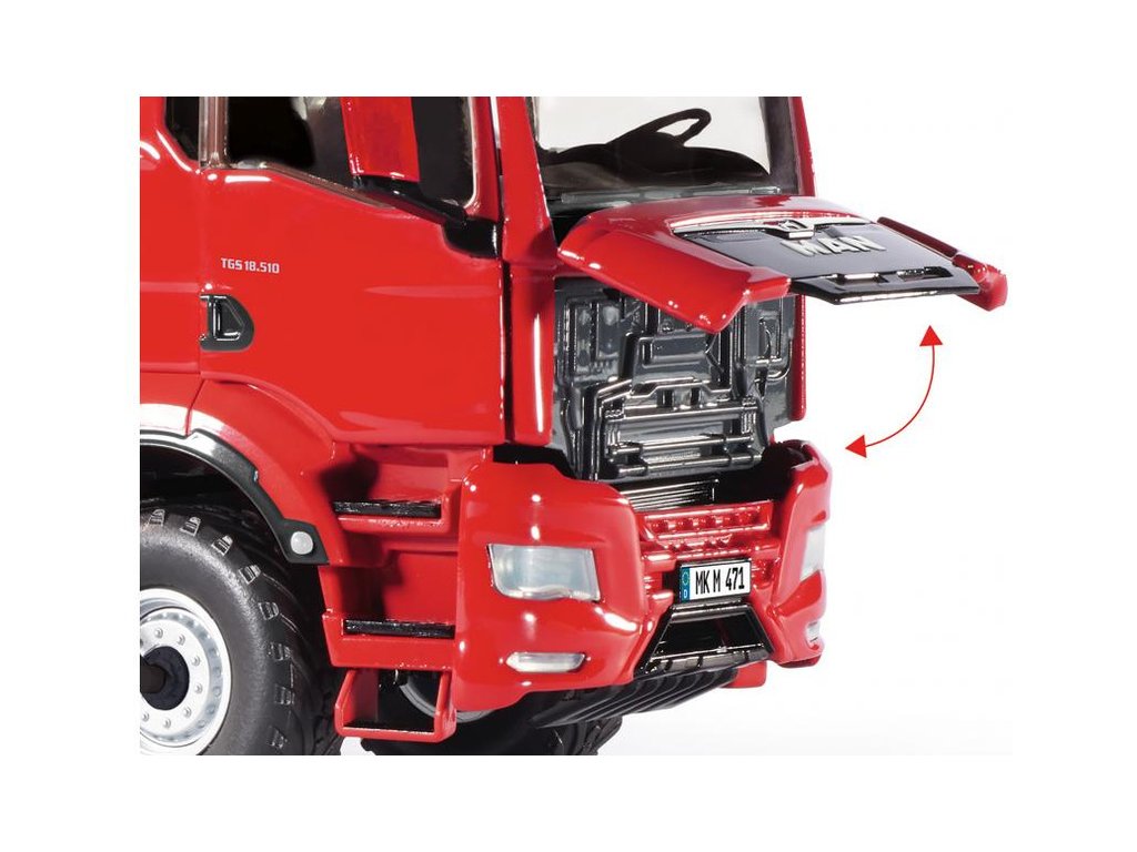 Kovový model tahače návěsů MAN TGS 2 červený v měřítku 1:32, potěší každého příznivce dopravy a zemědělské techniky. Hlavní části jako je kabina, rám podvozku apod. jsou vyrobeny z kovu, plastové části jsou použity pro detaily. Prvky jako jsou loga, registrační značka a nápisy jsou zpracovány pomocí potisku. Model obsahuje velké množství detailů a nechybí funkční části. Je vhodný na hraní pro děti, i ke sběratelským účelům.