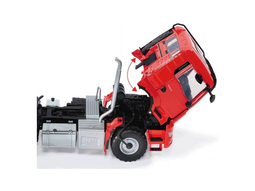 Kovový model tahače návěsů MAN TGS 2 červený v měřítku 1:32. Obsahuje detailně zpracovaný podvozek s kabinou, otevírací dveře a kapotu, výklopnou kabinu, zatáčení předních kol, aretace pro návěs a tažné zařízení. Vhodné pro hraní i sběratelství. Kvalitní autentické zpracování z kovu a plastu.