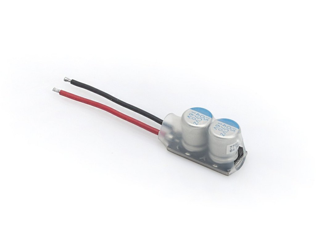 2x 470uf, napětí: 16V, vnitřní odpor: 0,004 Ohm, dynamické zatížení: 12,2A, rozměry: 31x13,6x15,2mm bez kabelů, váha 5g, k použití jak pro 1 i 2s LiPo sady.Doplňkové parametry
