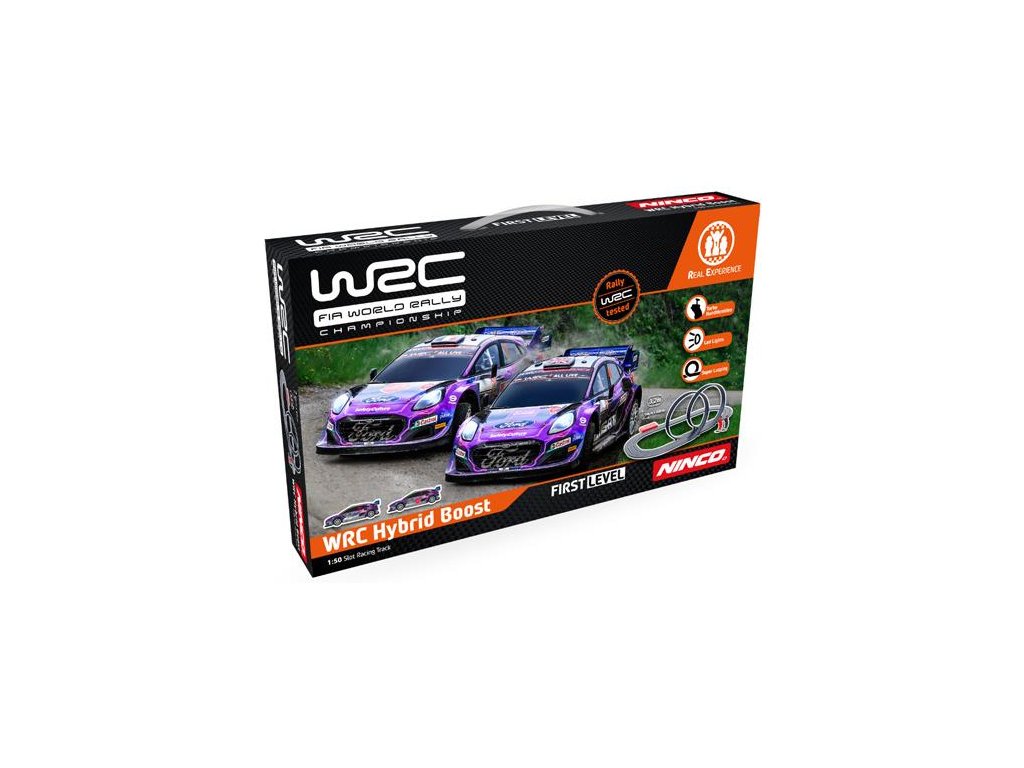Elektrická autodráha pro děti i dospělé v měřítku 1:50 - WRC Hybrid Boost. Délka tratě 3,2m, 2 auta rally, 4 konfigurace trati, dvojitý looping. Provoz na tužkové baterie. Ovladače jsou přizpůsobeny dětské ergonomii, mají funkci TURBO a omezení výkonu. Auta Ford Puma. Rozměry autodráhy 94 x 60 cm.