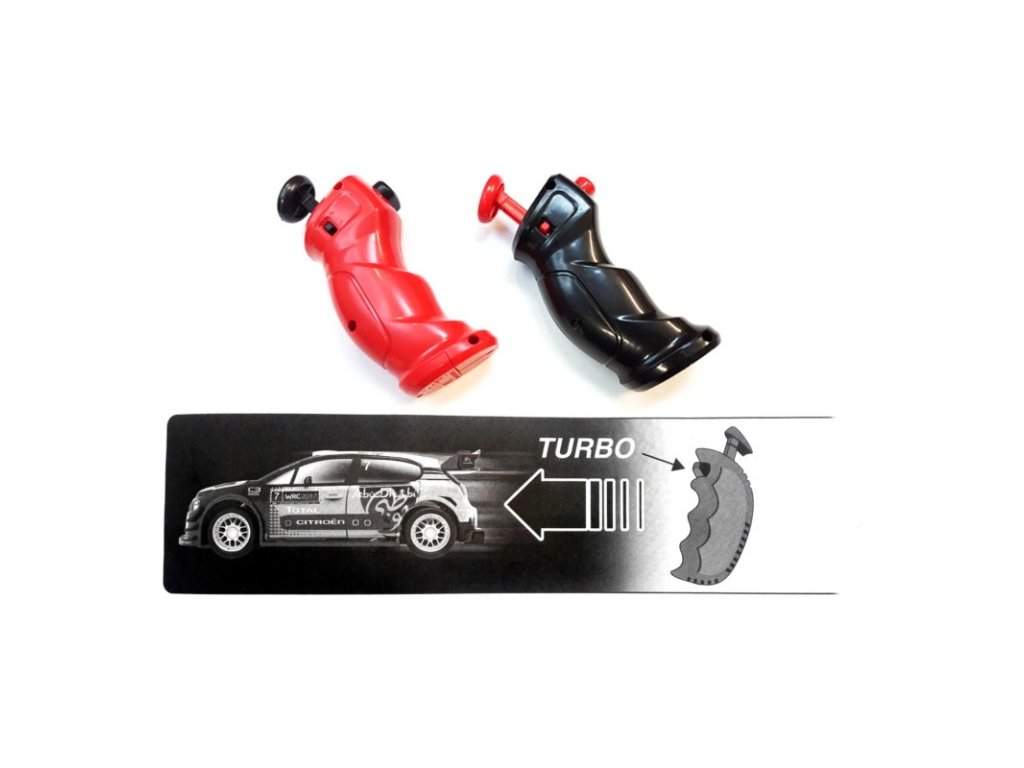 Každý ovladač, je kromě vypínače, vybaven proporcionální tlačítkem na ovládání plynu a tlačítkem TURBO, které okamžitě přidá plný plyn a zvýší rychlost autíčka na maximum.