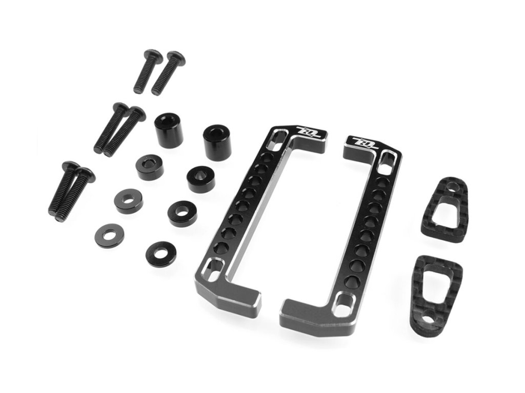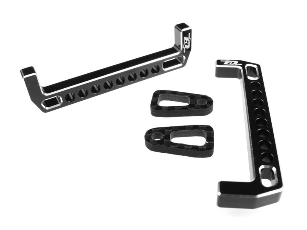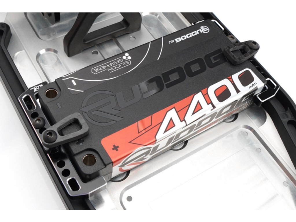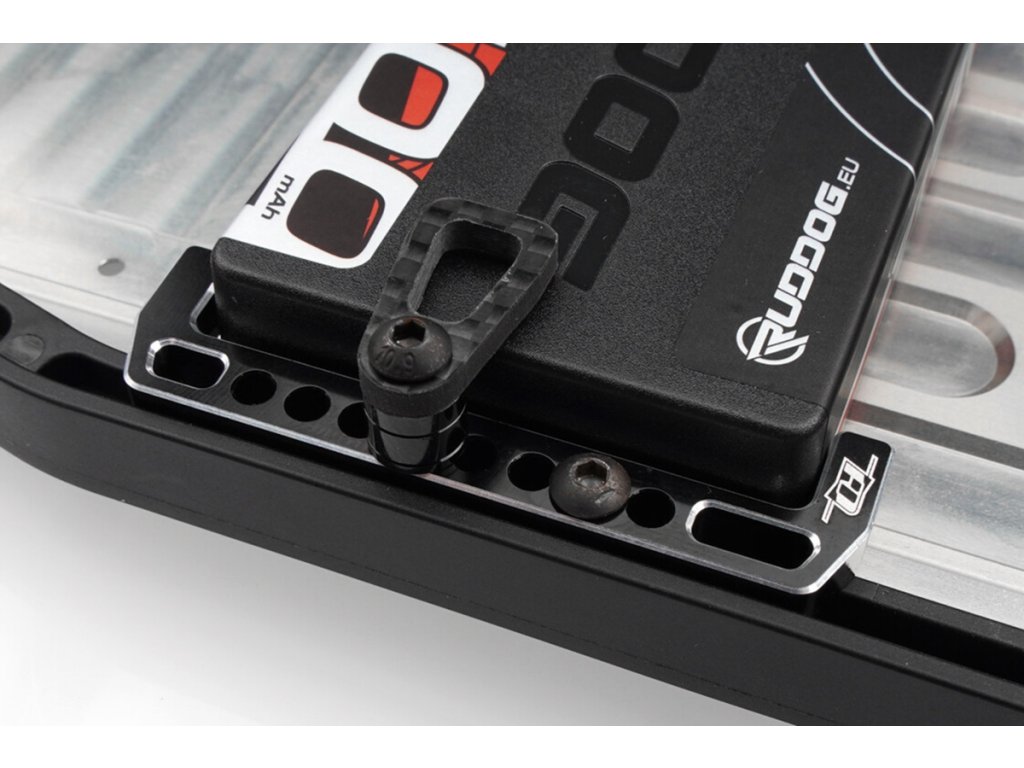 Držák je vyroben z vysoce kvalitního hliníku 7075-T6 s černě eloxovanou povrchovou úpravou a stříbrnými frézovanými hranami a poskytuje pevnost i styl. Lehké karbonové zámky udrží krátké LiPo akumulátory pevně na místě a zabrání jejich pohybu při zrychlení nebo po dopadu.