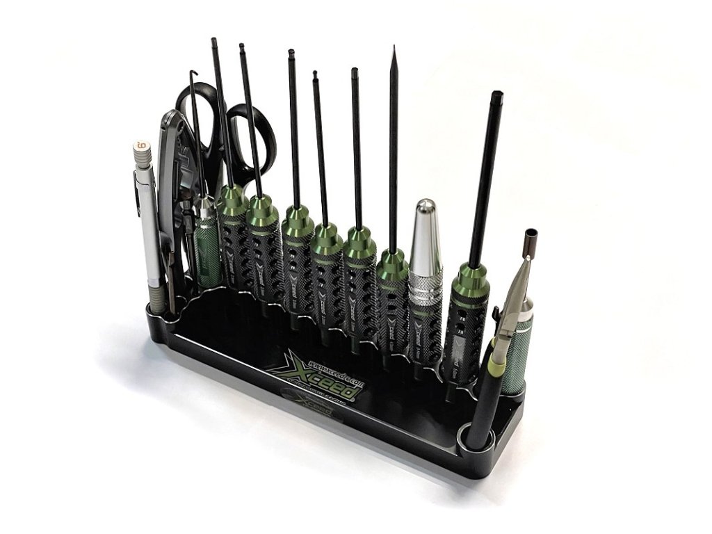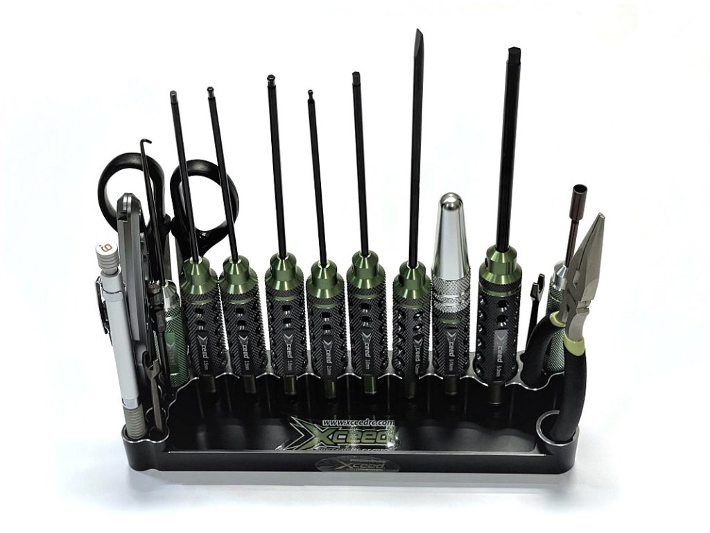 Jedná se o profesionální multifunkční stojánek na nářadí s integrovaným zásobníkem na díly. Xceed hliníkový stojánek na nářadí má několik obrobených otvorů pro nářadí a otvory o menším průměru pro uložení různých přípravků, jako jsou výstružníky karoserie, nářadí pro spojovačky, kleště, nůžky, pinzety, měřidla, lepidlo, fixy/tužky nebo jiné nástroje pro vaše RC podvozky. Integrovaná přihrádka na díly je skvělá pro držení nejrůznějších šroubů, matic, sponek pro karoserii, ale také drobného příslušenství, opěrných bloků, pájky, olejů, tuků a dalších. Tento skvěle navržený praktický stojan na nářadí vám pomůže udržet váš pracovní stůl uspořádaný, profesionální a vyniknout na něm.