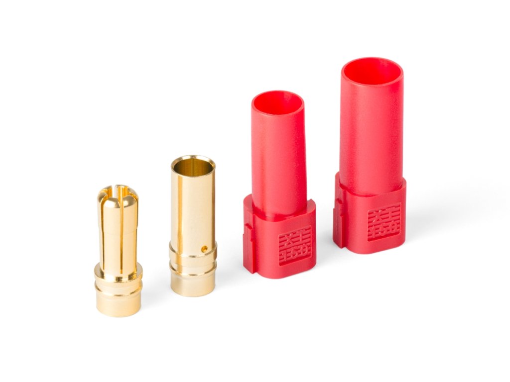 Silový konektor se 6 mm zlacenými kontakty se zatížitelností max. 100 A. Pro kabely o průřezu max. 8,4 mm2 (8AWG). Přechodový odpor 0,20 mOhm, max. 500 V. Balení 1 páru kontaktů s červeným pouzdrem.