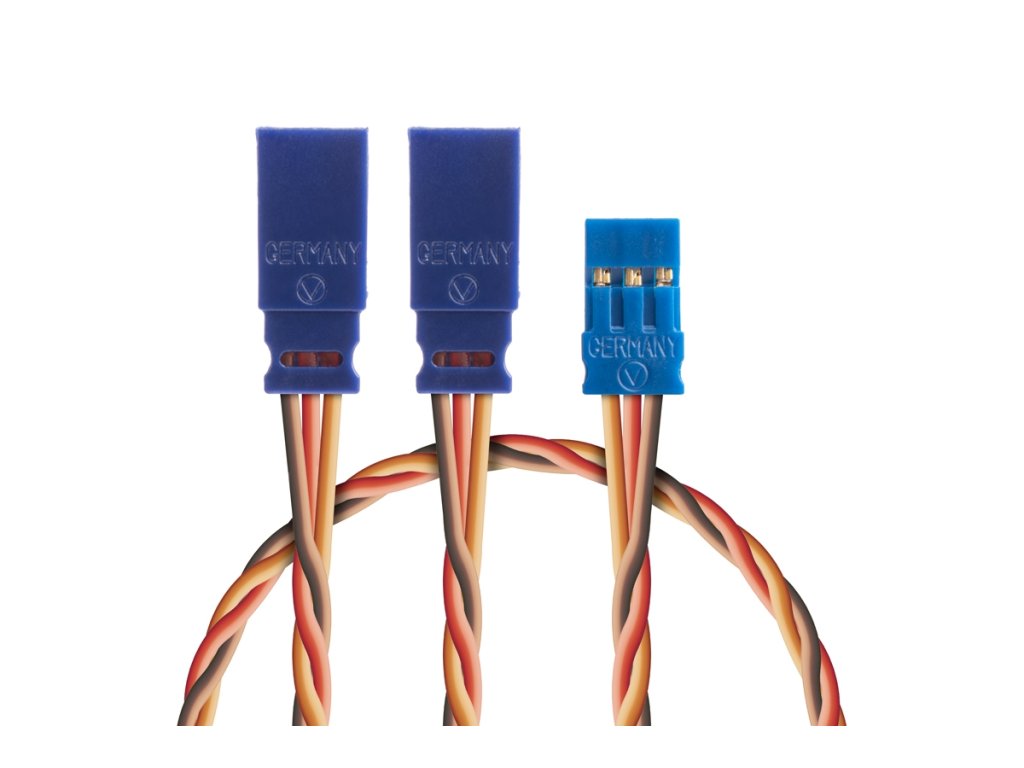 Kroucený velmi silný Y-kabel dlouhý s konektory JR o délce 300 mm se silikonovou izolací, průřez vodičů 0,35 mm2. Vyrobeno v Německu.