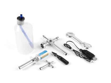 Sada obsahuje: Tankovací láhev 250ml, žhavítko s 2200mAh Aku a nabíječkou USB, Svíčkový klíč s držákem na stand. svíčky a klíčem 5,5 a 7mm, plastový chcípák výfuku, plastový...