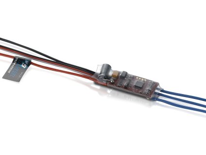 Střední řada regulátorů firmy Hobbywing pro modely letadel. Spínaný BEC 5,2V 2,5A. Trvalý proud 20A, špičkový 30A. Napájení 2-4S. Hmotnost 13g. Rozměry 25x15x5mm.