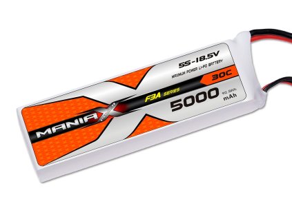 LiPo akumulátorová sada ManiaX se zatížitelností 30/60C, nabíjení 1-3C, max. 5C. Pětičlánek 5S 18,5V 5000 mAh, rozměry: 138x44x45mm, hmotnost: 550g, XT90 + servisní konektor...