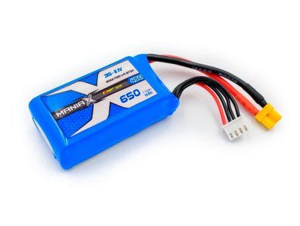 LiPo akumulátorová sada ManiaX se zatížitelností 70/140C, nabíjení 1-3C, max. 5C. Tříčlánek 3S 11,1V 650 mAh, rozměry: 64x23x22mm, hmotnost: 63g, XT30 + servisní konektor...