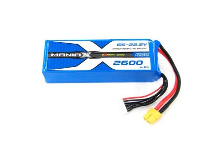 LiPo akumulátorová sada ManiaX se zatížitelností 45/90C, nabíjení 1-3C, max. 5C. Šestičlánek 6S 22,2V 2600 mAh, rozměry: 135x44x35mm, hmotnost: 410g, XT60 + servisní konektor...
