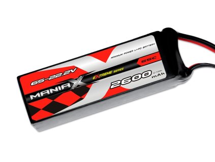 LiPo akumulátorová sada ManiaX se zatížitelností 55/110C, nabíjení 1-3C, max. 5C. Šestičlánek 6S 22,2V 2600 mAh, rozměry: 138x44x34mm, hmotnost: 424g, XT60 + servisní konektor...