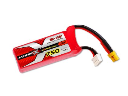 LiPo akumulátorová sada ManiaX se zatížitelností 70/140C, nabíjení 1-3C, max. 5C. Tříčlánek 3S 11,1V 750 mAh, rozměry: 60x24x24mm, hmotnost: 67g, XT30 + servisní konektor...