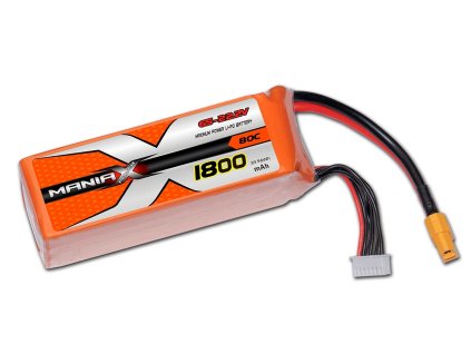 LiPo akumulátorová sada ManiaX se zatížitelností 80/160C, nabíjení 1-3C, max. 5C. Šestičlánek 6S 22,2V 1800 mAh, rozměry: 108x34x45, hmotnost: 330g, XT60 + servisní konektor...