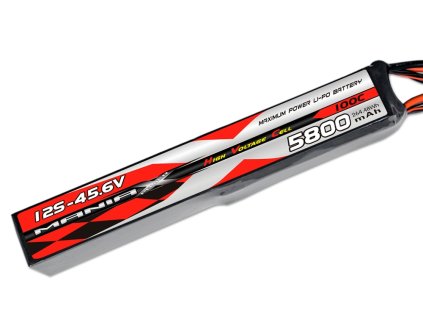 LiHV akumulátorová sada ManiaX se zatížitelností 100/200C, nabíjení 1-3C, max. 5C. Dvanáctičlánek 12S 45,6V 5800 mAh, rozměry: 310x48x52, hmotnost: 1650g, servisní konektor JST-XH.