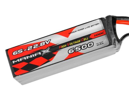 LiHV akumulátorová sada ManiaX se zatížitelností 100/200C, nabíjení 1-3C, max. 5C. Šestičlánek 6S 22,8V 6500 mAh, rozměry: 155x48x53, hmotnost: 860g, servisní konektor JST-XH.
