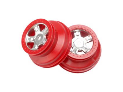 Disky kol univerzální SCT chromově matné s červeným ráfkem. Průměr disku 36/46mm (1.4/1.8"), šířka 25mm. Pro auta Traxxas Slash 1:16 nebo Teton 1:18. Šestihran 12mm.