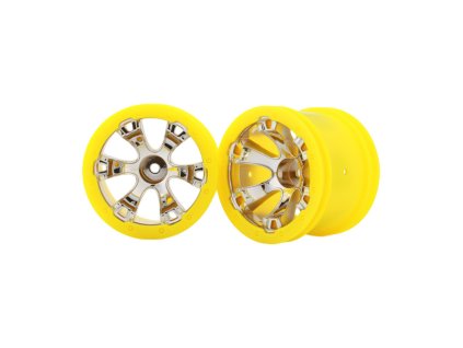 Disky kol univerzální Geode chromově lesklé se žlutým ráfkem. Průměr disku 56mm (2.2"), šířka 42mm. Pro auta Traxxas 1:16 Summit. Šestihran 12mm.