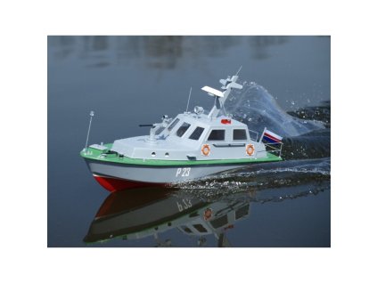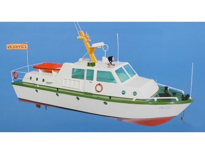 Stavebnice hlídkového člunu pro elektromotory řady 400. Model v rozsypu s trupem a nástavbami z plastu PSH, lodní hřídel, kormidlo a maketové příslušenství.